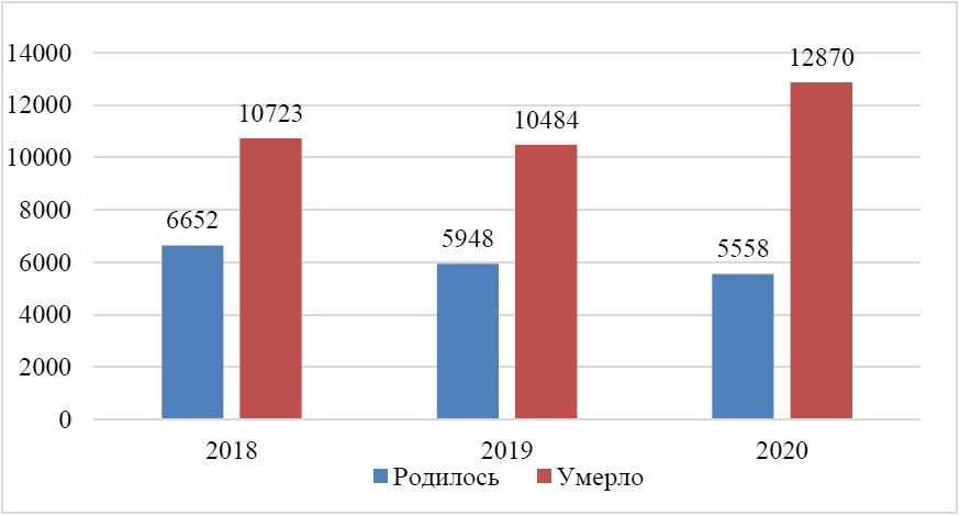 Исходя из данных табл.1, можно сделать вывод о ситуации естественной убыли на территории республики за период 2018-2020 гг. Наибольшие потери наблюдаются в 2020 году, число умерших превышало число родившихся на 7 312 чел. В 2018 году отмечается наименьшая убыль за анализируемый период и составляет 4 008 чел.