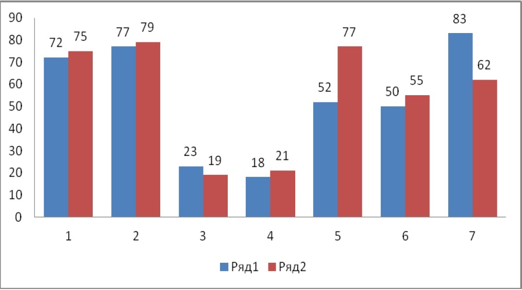 *Условные обозначения:  ряд  1  –  группа  I,  ряд  2  –  группа  II;  1  –  7  –  мотивы  студентов-спортсменов (1 – денежный заработок, 2 – стремление к продвижению в спортивной карьере, 3 – стремление избежать критики со стороны тренера, 4 – стремление избежать возможных наказаний или неприятностей, 5 – потребность в достижении социального престижа и уважения со стороны других, 6 – удовлетворение от самого процесса и результата спортивной деятельности, 7 – возможность наиболее полной самореализации именно в данной деятельности).