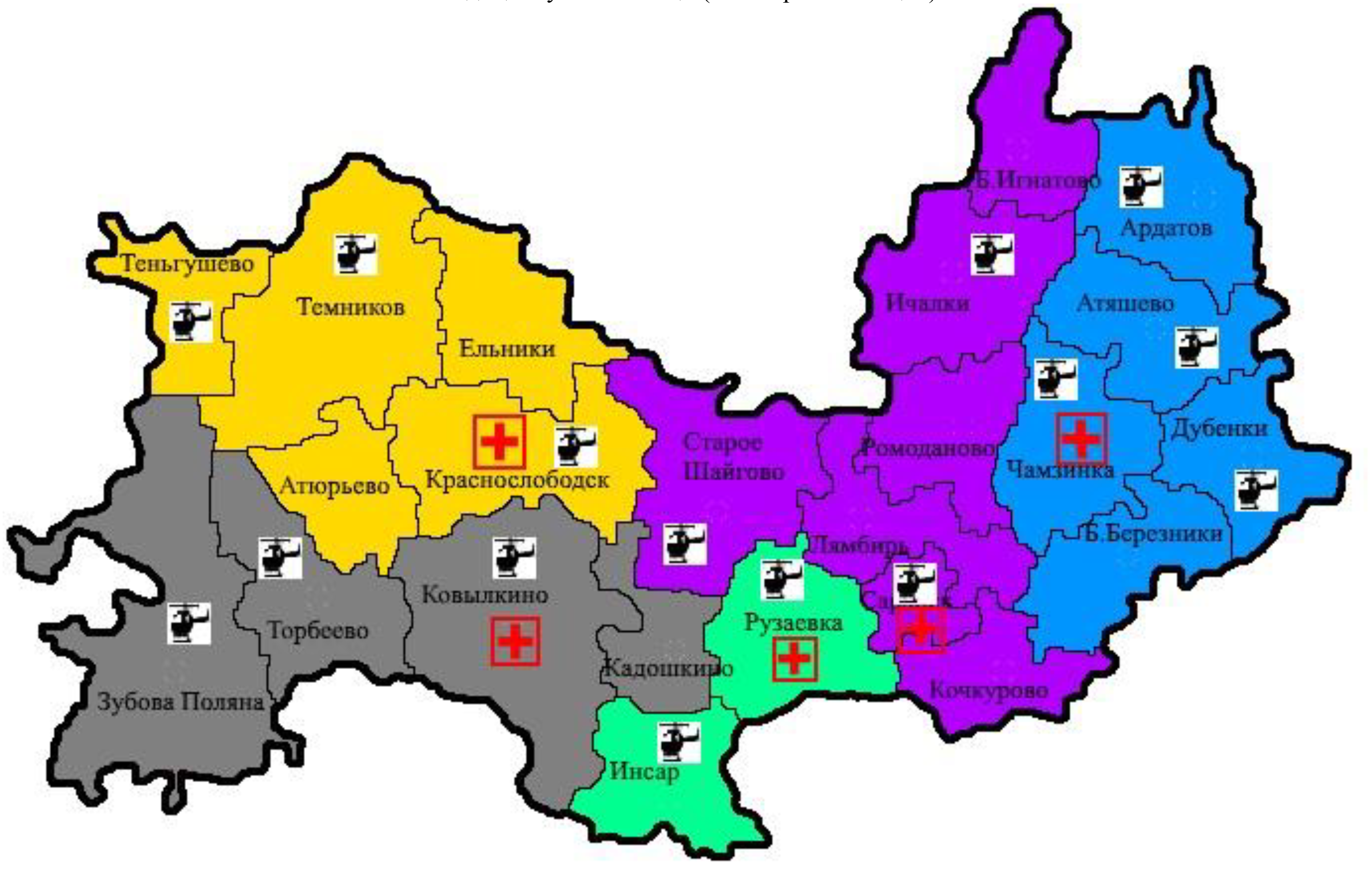 С 2019 г. в Мордовии благодаря региональному проекту «Развитие системы оказания первичной медико-санитарной помощи» национального проекта «Здравоохранение» начала работать санитарная авиация. Согласно территориальному планированию сети медицинских организаций Республики Мордовия на 2025 г., вертолетные площадки для санитарной авиации должны быть в 15 районах республики (рисунок).