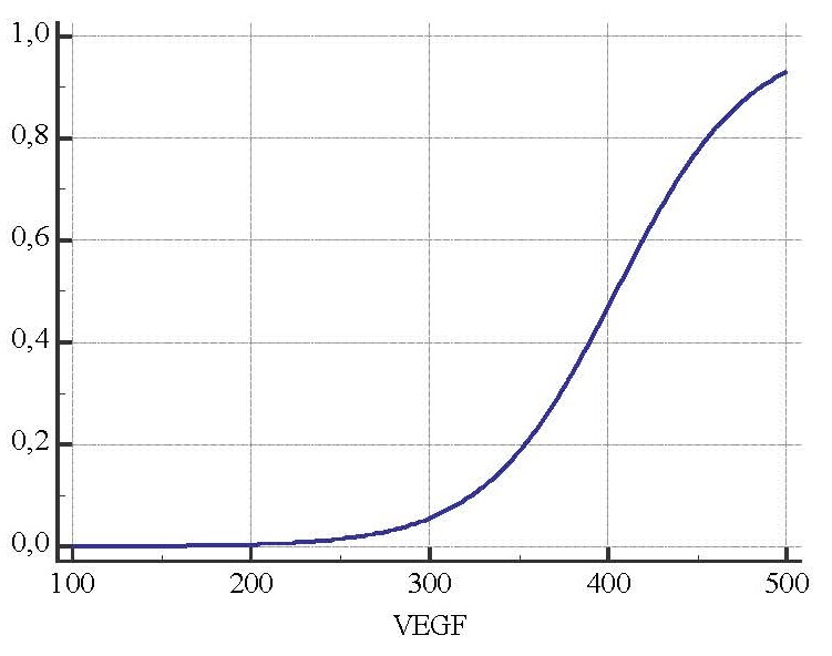 Рис. 1. Зависимость вероятности гастродуоденального кровотечения от количества фактора роста эндотелия сосудов (пг/мл).