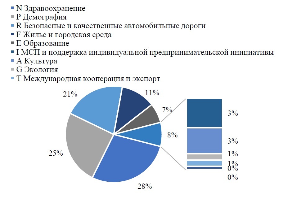 Распределение в целом по России не отличается от плановых значений в Пензенской области: на первых пяти позициях также отмечены: Здравоохранение, Демография, Безопасные и качественные автомобильные дороги, Жилье и городская среда, Образование. Такое распределение финансирования демонстрирует приоритетные направления социально-экономической политики в России в целом, и в Пензенской области - в частности.