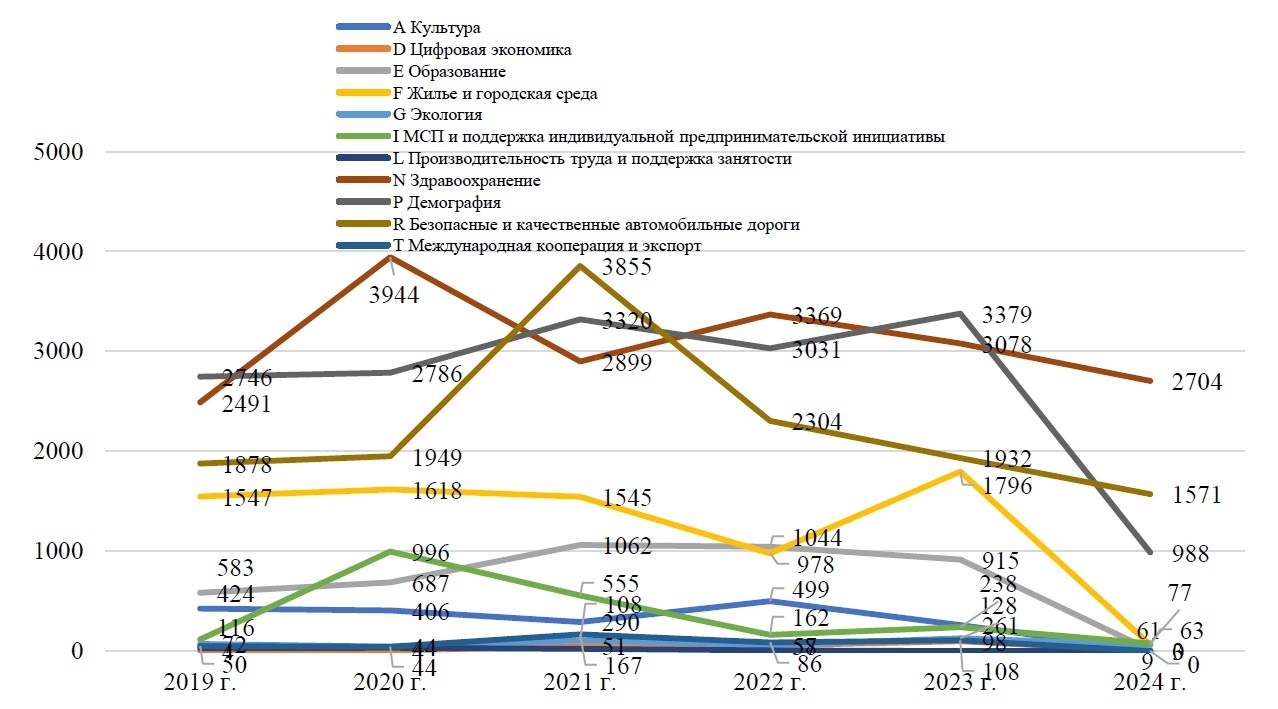В ходе исследования была проанализирована плановая структура финансирования 11 национальных проектов, реализуемых в Пензенской области за 2019-2024 гг. (рис. 1). В приоритетной пятерке национальных проектов по финансированию в Пензенской области находятся: Здравоохранение, Демография, Безопасные и качественные автомобильные дороги, Жилье и городская среда и Образование, а три первых проекта получают более 70% общего объема финансирования.
