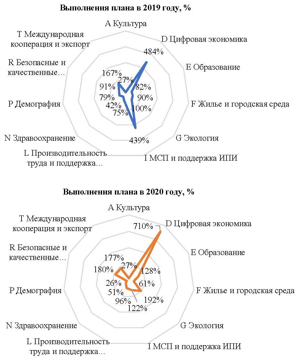 Анализ выполнения плана реализации национальных проектов за 2019 и 2020 гг. (рис. 3) показал, что структура финансирования претерпела значительные изменения по сравнению с запланированными показателями [2; 3]. По одному из самых недофинансированных проектов Цифровая экономика процент выполнения плана составил 484% в 2019 г. и 710% в 2020 г., что говорит о серьезной смене приоритетов и осознании важности процессов цифровизации для региональной экономики. Большое внимание в 2019 г. было уделено Проекту Малое и среднее предпринимательство и поддержка индивидуальной предпринимательской инициативы, его финансирование составили 484% от плана.