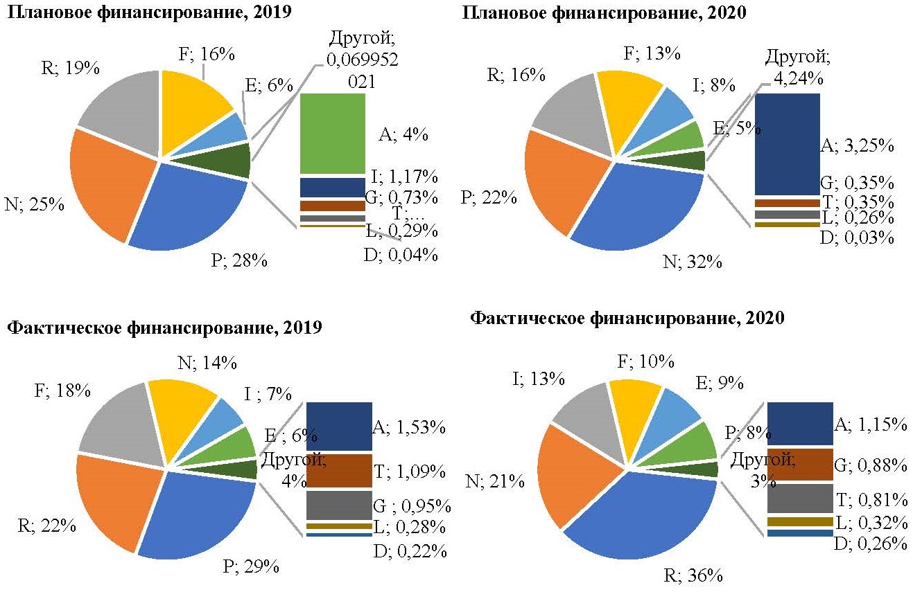 Анализ структуры плановых и фактических показателей финансирования национальных проектов (рис. 4) показал, что структура не однородна и подвержена значительному изменению в 2020 году по сравнению с 2019 как в плановых, так и в фактических значениях [2; 3]. Вместе с эти при сравнении плановых и фактических значений можно отметить, что структура фактических значений более неоднородная. Однако перераспределение объемов финансирования происходит только среди первых мест, в то время как последние места, как в плановом, так и в фактическом периоде принадлежат одним и тем же недофинансированным проектам Экология, Международная кооперация и экспорт, Производительность труда и поддержка занятости, Цифровая среда.
