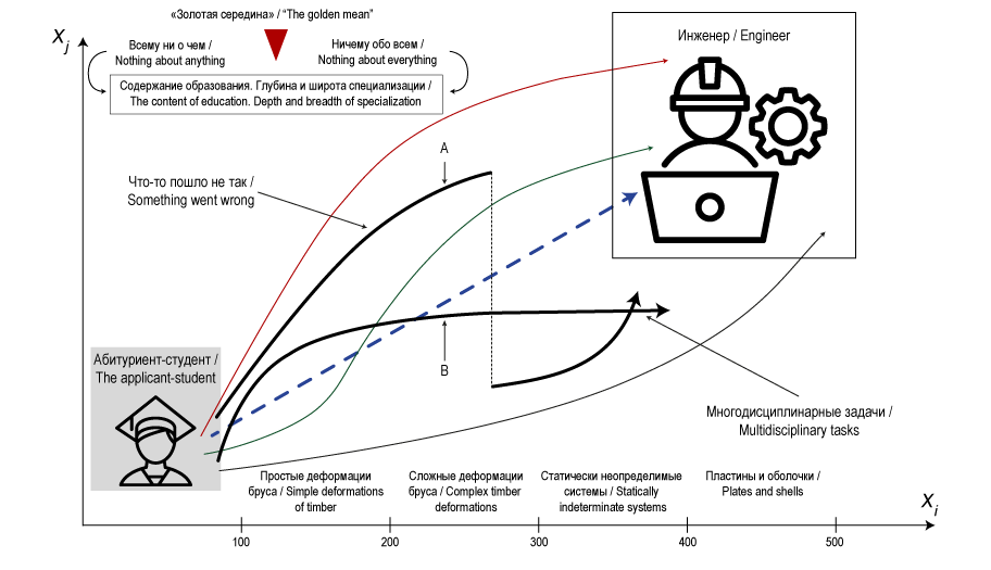 В процессе обучения в статусе студента обучающийся совершает движение в данном пространстве по некоторой траектории из начальной точки ( – ее координатный вектор) и достигает в итоге некоторой целевой точки ( – ее координатный вектор), которая принадлежит целевой подобласти в этом пространстве – гораздо более значительных размеров, чем начальная подобласть – и является удаленной от начала отсчета на гораздо более значительное расстояние. Факт принадлежности конечной точки этой целевой подобласти является критерием того, что обучающийся приобрел квалификацию «инженер».