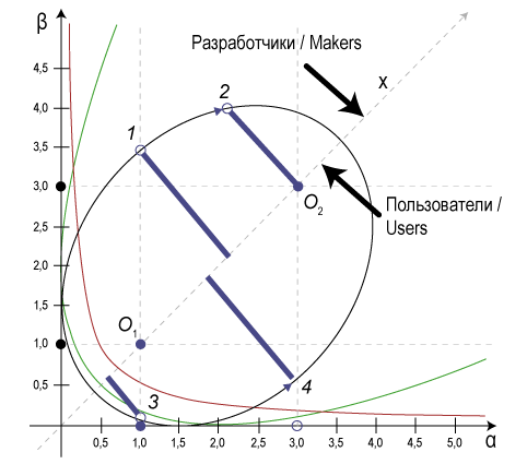 Эллипс иллюстрирует следующее: при расширении специализации (многоаспектности), т. е. при увеличении α глубина специализации разработчика снижается (движение от точки 1 до точки 2); глубина специализации пользователя наоборот возрастает (движение от точки 3 до точки 4). Эта кривая соответствует студентам, которые проявляют на данном интервале склонность и к деятельности пользователя, и к деятельности разработчика одновременно. Однако, чтобы добиться оптимума нужно быть внимательным с многоаспектностью. Таких студентов, как правило, большинство (до 80 %).