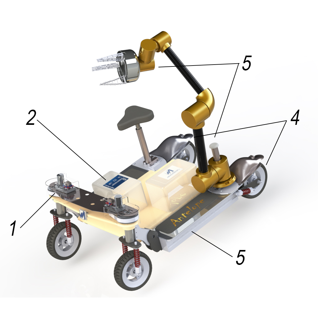 Рис. 3. Интегрированные модели: а) натурная модель; б) виртуальная модель: 1 – механические передачи, рулевое управление; 2 – система управления, радиосвязь, телеметрия, очувствление (сенсорика); 3 – технологический модуль; 4 – движители; 5 – энергообеспечение
