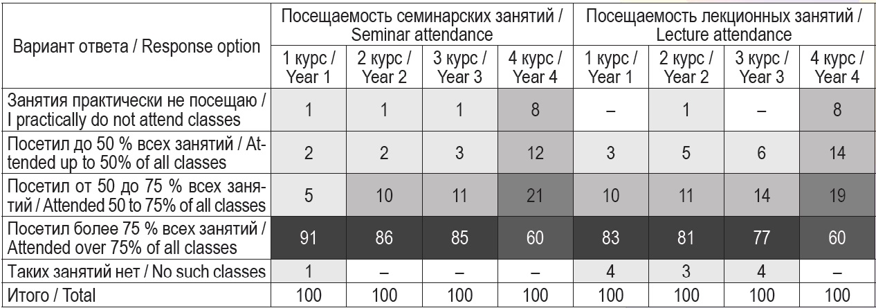 Динамика вовлеченности по курсам обучения носит неравномерный характер. Пик академической активности приходится на второй и третий курсы. К четвертому курсу доля студентов, посещающих более 75 % занятий, снижается с 91 до 60 % (семинары) и с 83 до 60 % (лекции) (табл. 3).