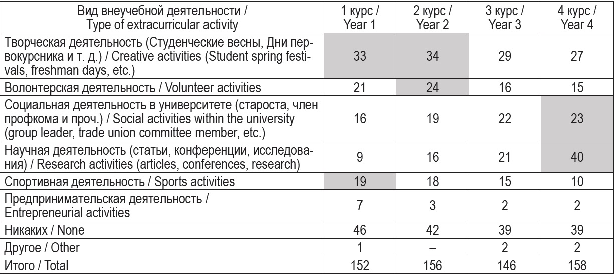 В социальной сфере студенты младших курсов преимущественно ориентированы на социализацию и развлекательные мероприятия, тогда как старшекурсники фокусируют свое внимание на развитии профессиональных компетенций (табл. 4).
