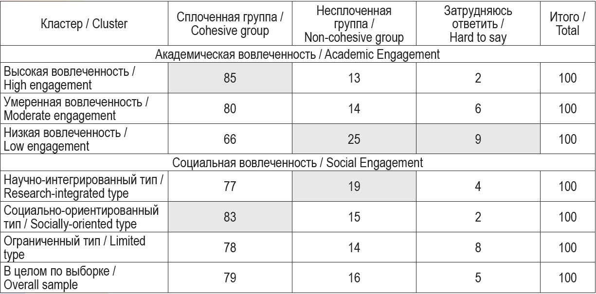 Таблица 7. Оценка студентами сплоченности своей группы, в зависимости от уровня академической и социальной вовлеченности, %