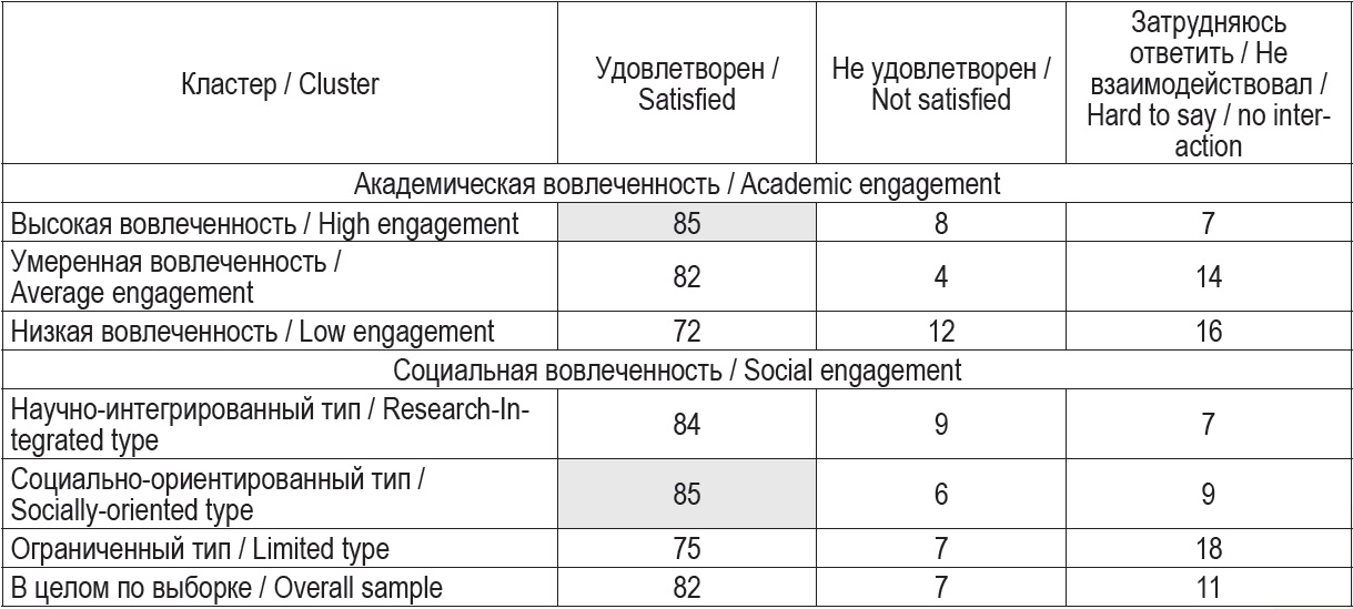 Удовлетворенность общением как с одногруппниками, так и с преподавателями также выступает фактором, способствующим вовлеченности. Во всех категориях взаимодействия наблюдается устойчивая закономерность: удовлетворенность взаимодействием с университетскими сообществами достигает пика у вовлеченных студентов (93 % высокоактивных довольны общением с одногруппниками, 95 % научно-интегрированных – с преподавателями). Низкововлеченные студенты, напротив, демонстрируют дефицит коммуникаций и испытывают неудовлетворенность в данной сфере (табл. 8).