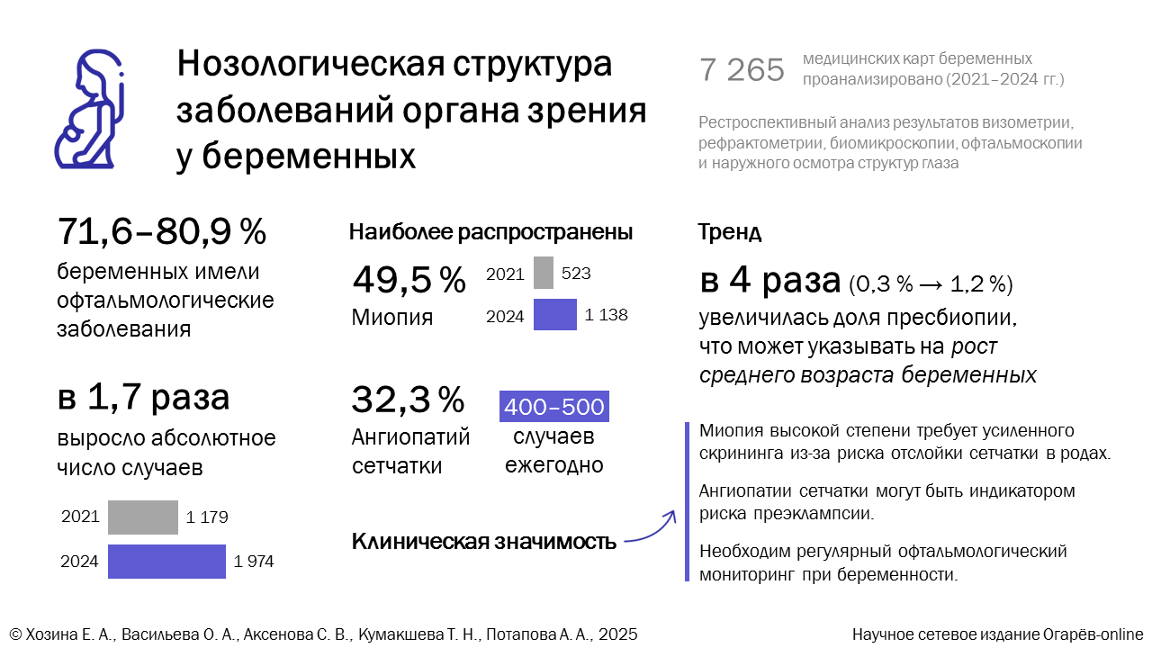 Results. The proportion of pregnant women with ophthalmological pathologies in 2021–2024 ranged from 71.6 to 80.9 %. The most common conditions were myopia and retinal angiopathies. A steady increase in the detection of myopia was noted, while the number of angiopathies remained relatively stable (400–500 cases annually).
