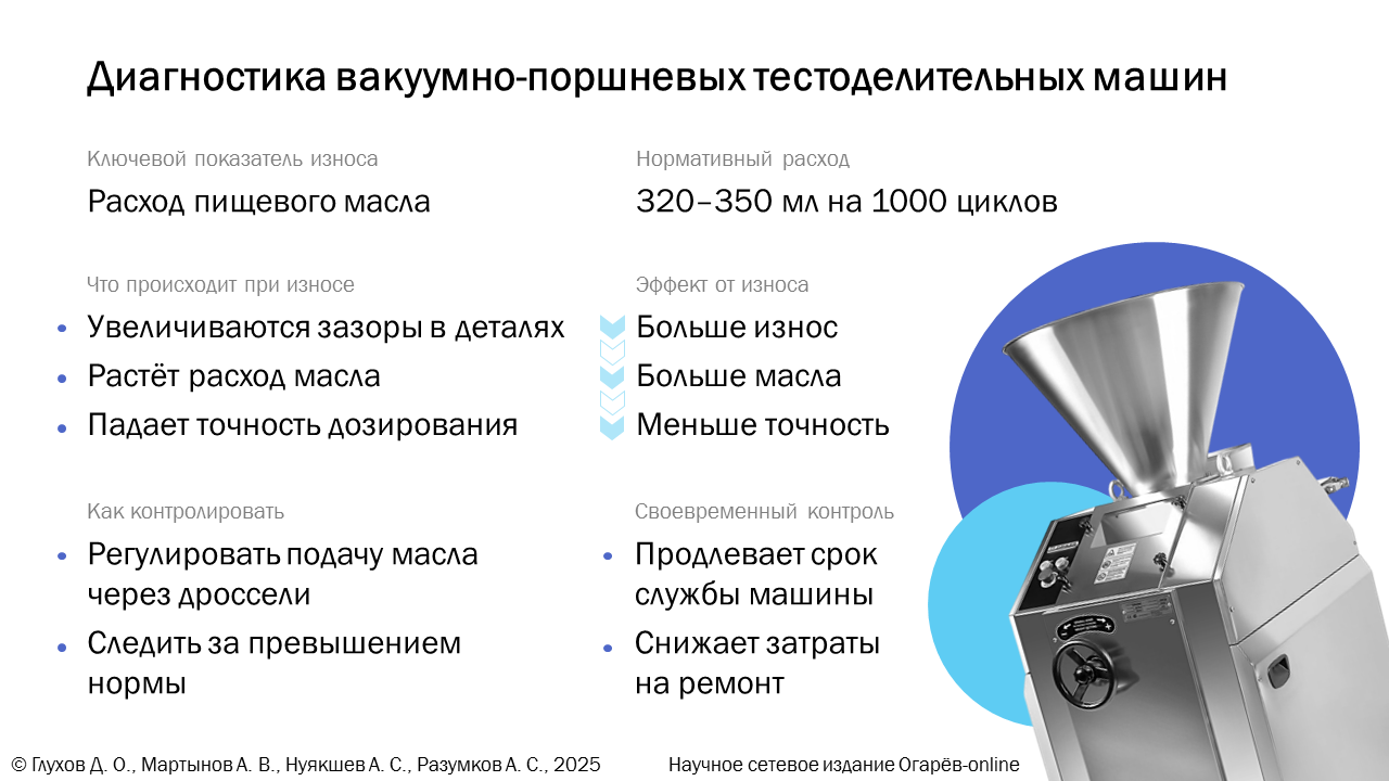 Discussion and Conclusion. It is shown that the consumption of food oil is a diagnostic criterion for the parts wear. To temporarily compensate for the parts wear, a short-term increase in the oil supply from the pump to the maximum value is carried out by opening the throttles. Timely monitoring helps to extend the equipment service life. The proposed methodology can be used by technical service enterprises.