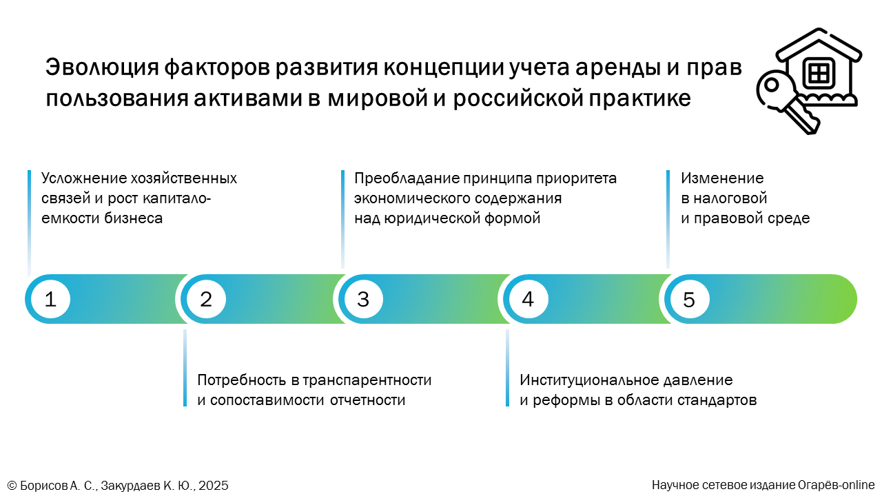 Results. Main factors include the growing complexity of business relations, the need for reporting transparency, the shift from legal form to economic substance, institutional reforms, and the impact of tax and regulatory environments. The adoption of International Financial Reporting Standards (IFRS 16) and Federal Accounting Standard (FSBU 25/2018) has aligned Russian practice with global standards, emphasizing the recognition of right-of-use assets and lease liabilities.