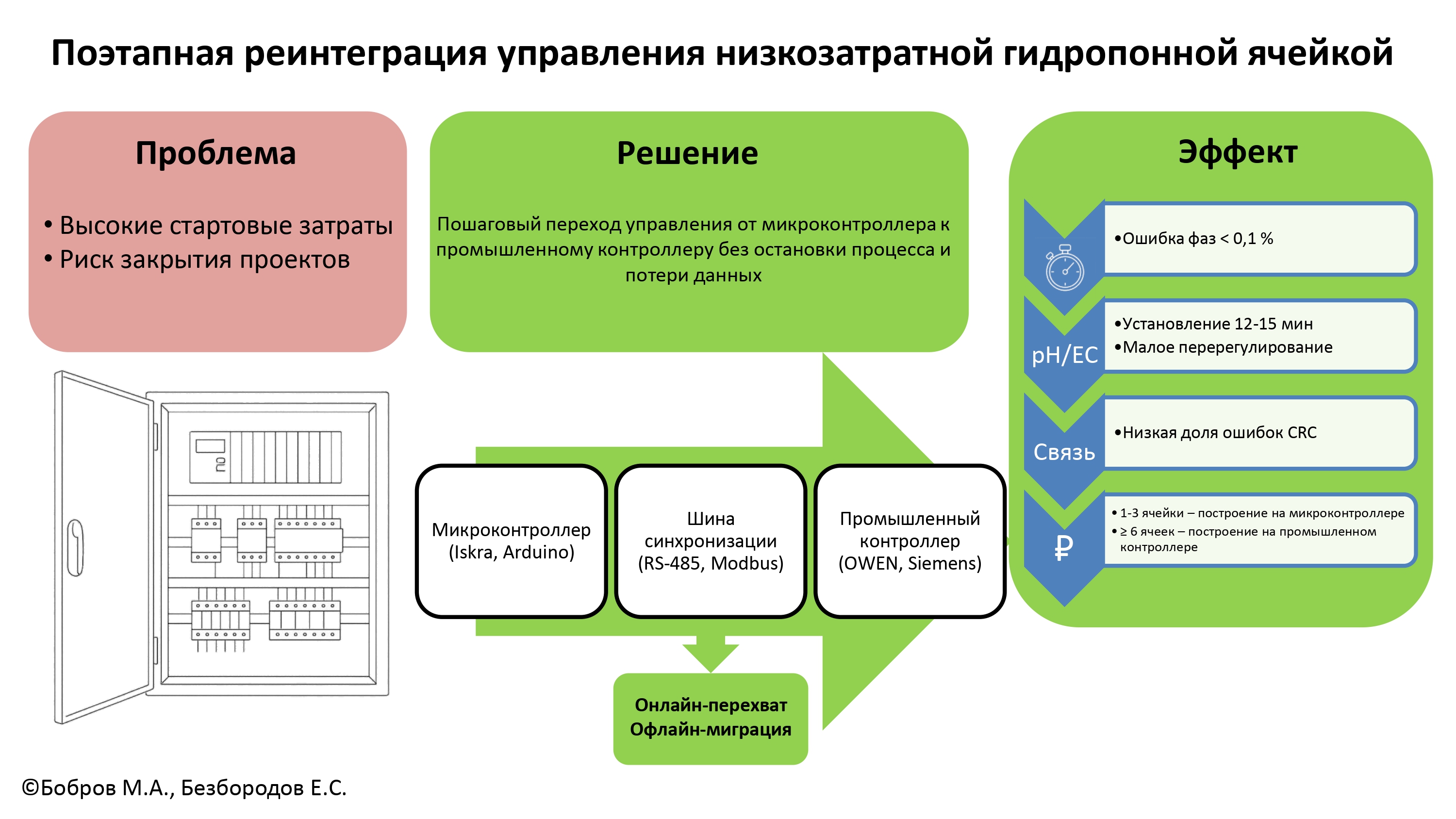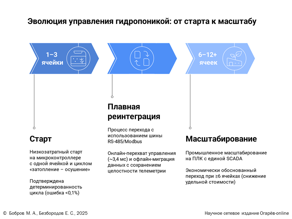 Discussion and Conclusion. The feasibility of multi-stage transition from a microcontroller to industrial implementation is confirmed. The synchronization bus and address-based subroutine activation provide a seamless handover and preserve data integrity. Economically, the microcontroller is justified for 1–3 cells, whereas industrial controllers are preferable for ≥ 6–12 cells. The results are useful for industrial automation and control system (IACS) integrators and vertical-farm developers, offering step-by-step procedures for online/offline reintegration, requirements for bus/addressing, and criteria for transitioning to industrial implementation when scaling the system.