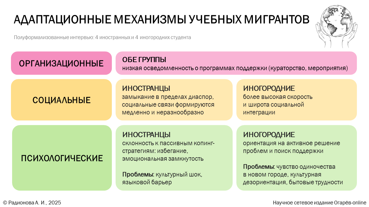 Results. The results demonstrate that the process of adaptation of educational migrants is determined by the complex interaction of organizational, social and psychological mechanisms. Low awareness of students about the organizational support of the university has been established. The language barrier and cultural shock significantly complicate the adaptation process for international students, while non-local students face mainly practical and academic problems.
