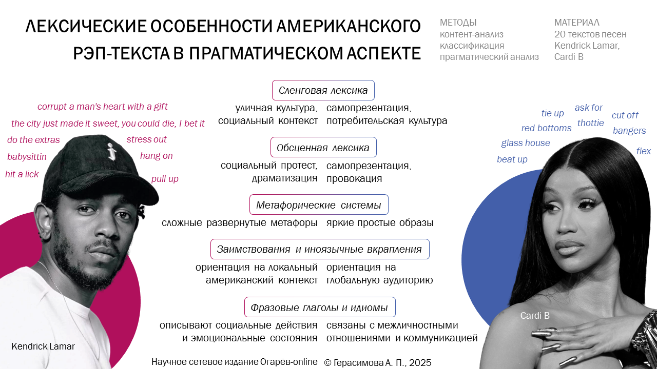 Results. The classification of lexical units frequently used in modern American rap lyrics was developed, which includes slang, obscene vocabulary, abbreviations, metaphors, name-dropping, phrasal verbs and idioms. The thematic groups of the lexical units were defined. The analysis of rap lyrics by Kendrick Lamar and Cardi B showed the differences in their vocabulary choices and pragmatics of the vocabulary use revealing individual stylistic preferences of the rappers.