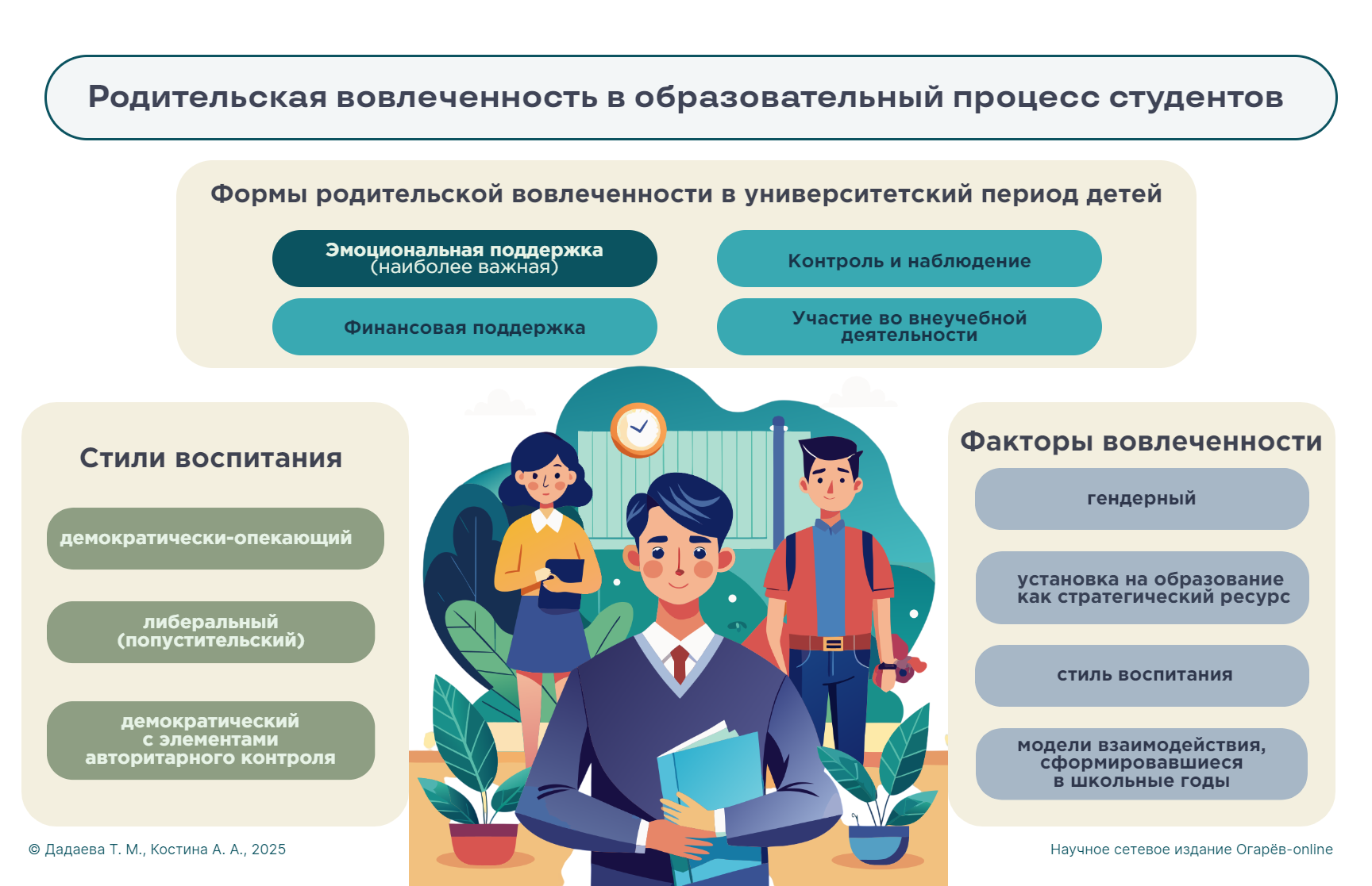 Results. Four main forms of parental involvement during the university period have been identified and classified: emotional, financial support, control and supervision, participation in extracurricular activities. Three parenting styles have been identified that determine the nature and intensity of engagement: democratically protective, liberal (permissive), and democratic with elements of authoritarian control. It has been established that emotional support based on trust has the most positive effect on students' learning motivation and well-being. Mothers are more involved in the learning process than fathers. The key factor determining the activity of parents is the attitude towards education as a strategic resource.