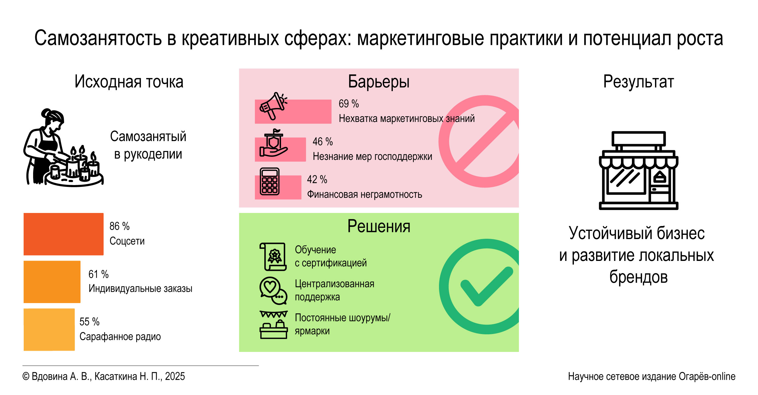 Results. It has been established that self-employed in creative industries use social networks (86%), individual orders (61%) and personal sales (55%) to promote goods. Respondents are in need of additional competencies in the field of marketing and SMM (69%), financial literacy (42%) and raising awareness of state support measures (46%). Plans to expand the business are associated with the increase in activities on social media (61%) and participation in offline events (51%).