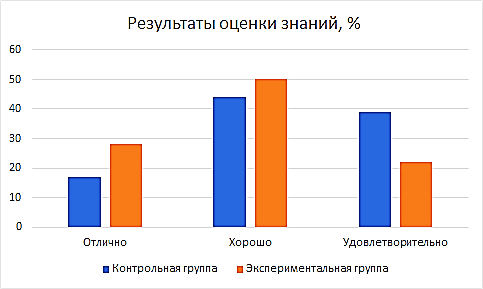 На диаграмме (рис. 6) наглядно показано повышение результатов у ЭГ (2023 г.) в сравнении с КГ (2022 г.). Уменьшился процент с удовлетворительными оценками на 17 %, на 6 % увеличилось количество оценок «хорошо» и на 13 % увеличилось количество оценок «отлично». Среднее значение оценки возросло с 3,79 у КГ до 4,06 у ЭГ. Такой результат доказывает эффективность предложенных авторских разработок.