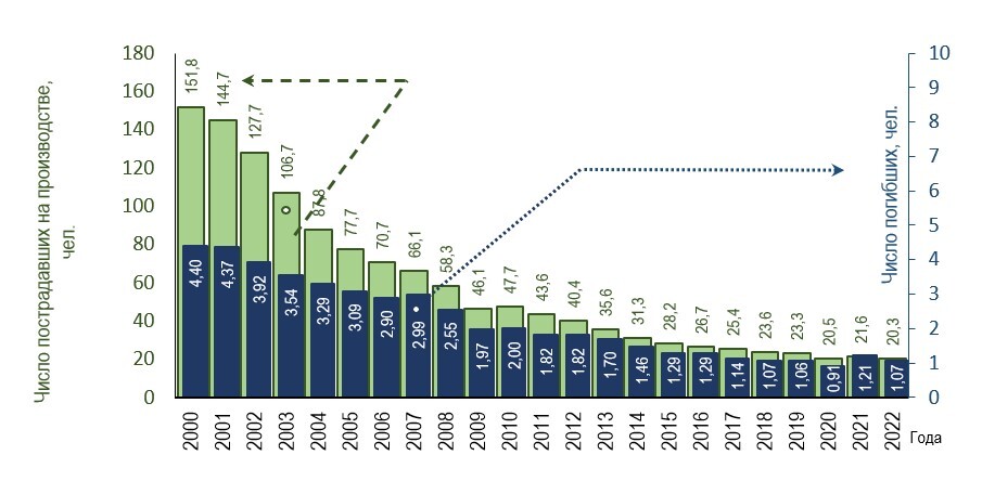 В организациях гражданской авиации, в рамках отраслевых исследовательских инициатив, десятилетиями собираются и тщательно изучаются статистические данные о травмах и условиях труда [Гамзаев, 2022]. Ежегодно (ранее также ежеквартально) издаваемый итоговый документ включает информацию о производственном травматизме, условиях труда и выполнении основных работ по охране труда в организациях гражданской авиации. Данные отраслевого мониторинга, не включающего статистику пострадавших в авиационных происшествиях (АП), приведенные на рисунке 7, показывают, что в период с 1995 по 2022 год на предприятиях гражданской авиации произошло почти трехкратное снижение числа несчастных случаев, а также на порядок сократилась смертность вследствие полученных травм.