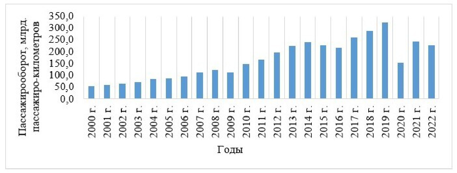 Роль гражданской авиации (ГА) в экономике нашей страны значительна, она постоянно увеличивалась с момента окончания Великой Отечественной войны. Последние десятилетия для огромной территории РФ воздушный транспорт (ВТ) во многих случаях стал основным связующим звеном, обеспечивающим целостность государства, особенно в деле освоения восточных и приполярных территорий, арктической зоны Дальнего Востока [Полешкина и др., 2023]. Доля ВТ при перевозках грузов незначительна, преимущественно перевозятся особо ценные грузы и почта. При этом, по данным Росстата [Пассажирооборот…, б.г.], ВТ занимает ведущее место в пассажирообороте1 в нашей стране, что иллюстрирует рисунок 1. Несмотря на снижение объемов деятельности отечественной ГА из-за «ковидных» и «санкционных» ограничений, суммарный ежегодный пассажирооборот отечественных авиакомпаний сохранился на уровне 200 млрд пассажиро-километров в год, что иллюстрирует рисунок 2.