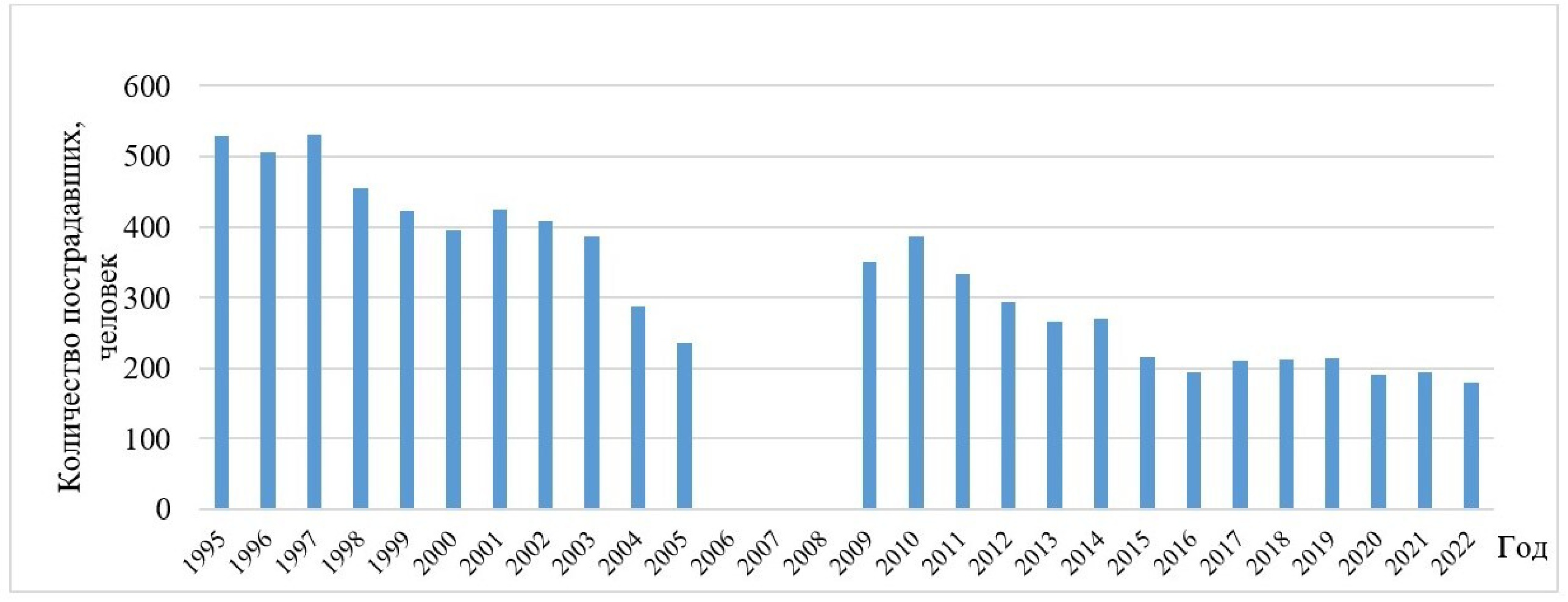 Данные отраслевого мониторинга [План НИОКР ФАВТ…, 2020] свидетельствуют о том, что за последнее тридцатилетие на авиапредприятиях ГА произошло очень резкое (почти трехкратное) уменьшение числа ежегодно страдающих в несчастных случаях на производстве (рис. 6) и на порядок сократилась число летальных случаев.
