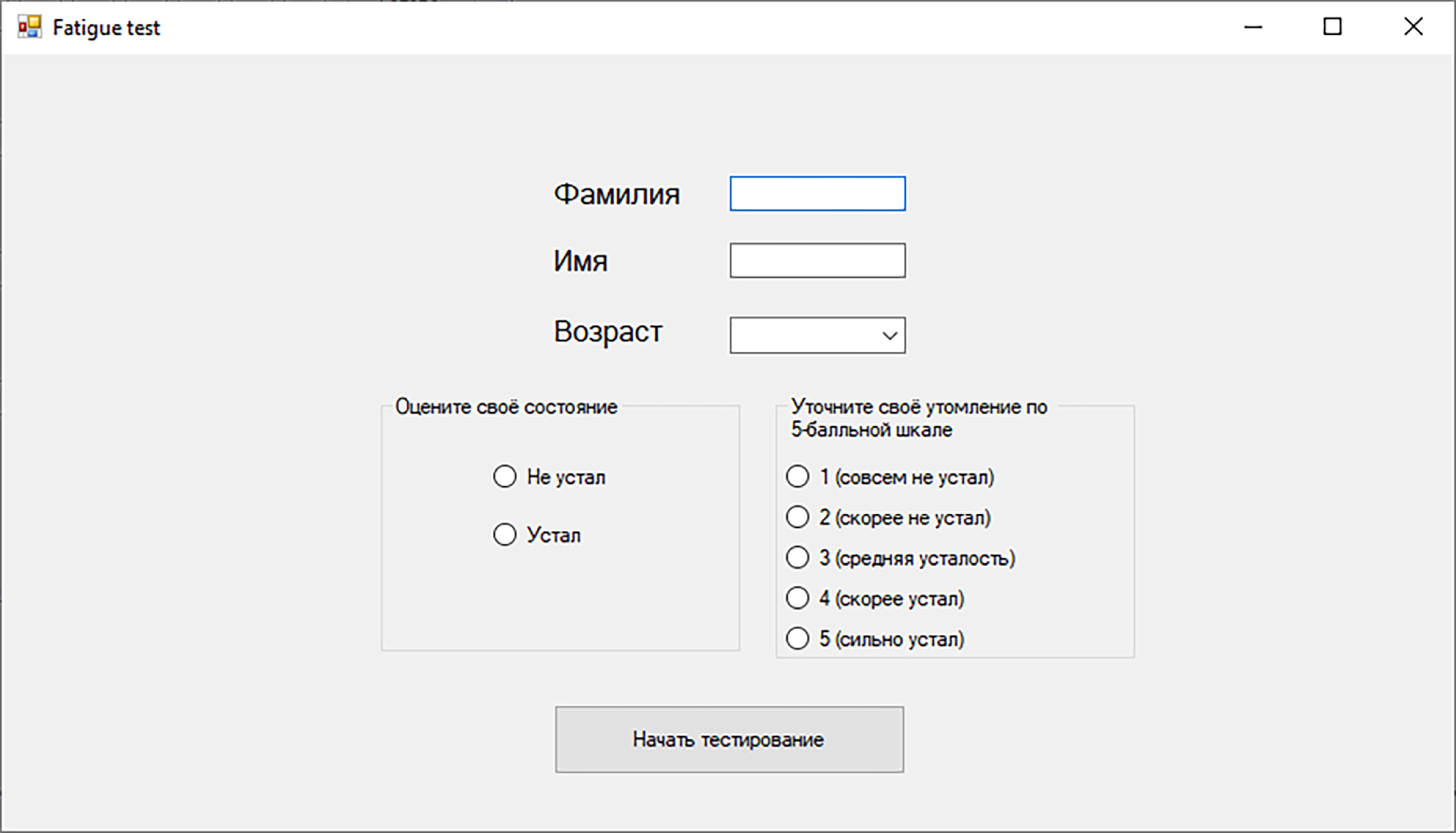 Описанные тесты были реализованы в программном продукте Fatigue Test, написанном в среде разработки MS Visual Studio (свидетельство № 2023617671 от 12.04.23 г.). Пользователю – испытуемому предлагалось зарегистрироваться в приложении и пройти перечисленные виды тестирования. Начальное окно программы представлено на рисунке 1.