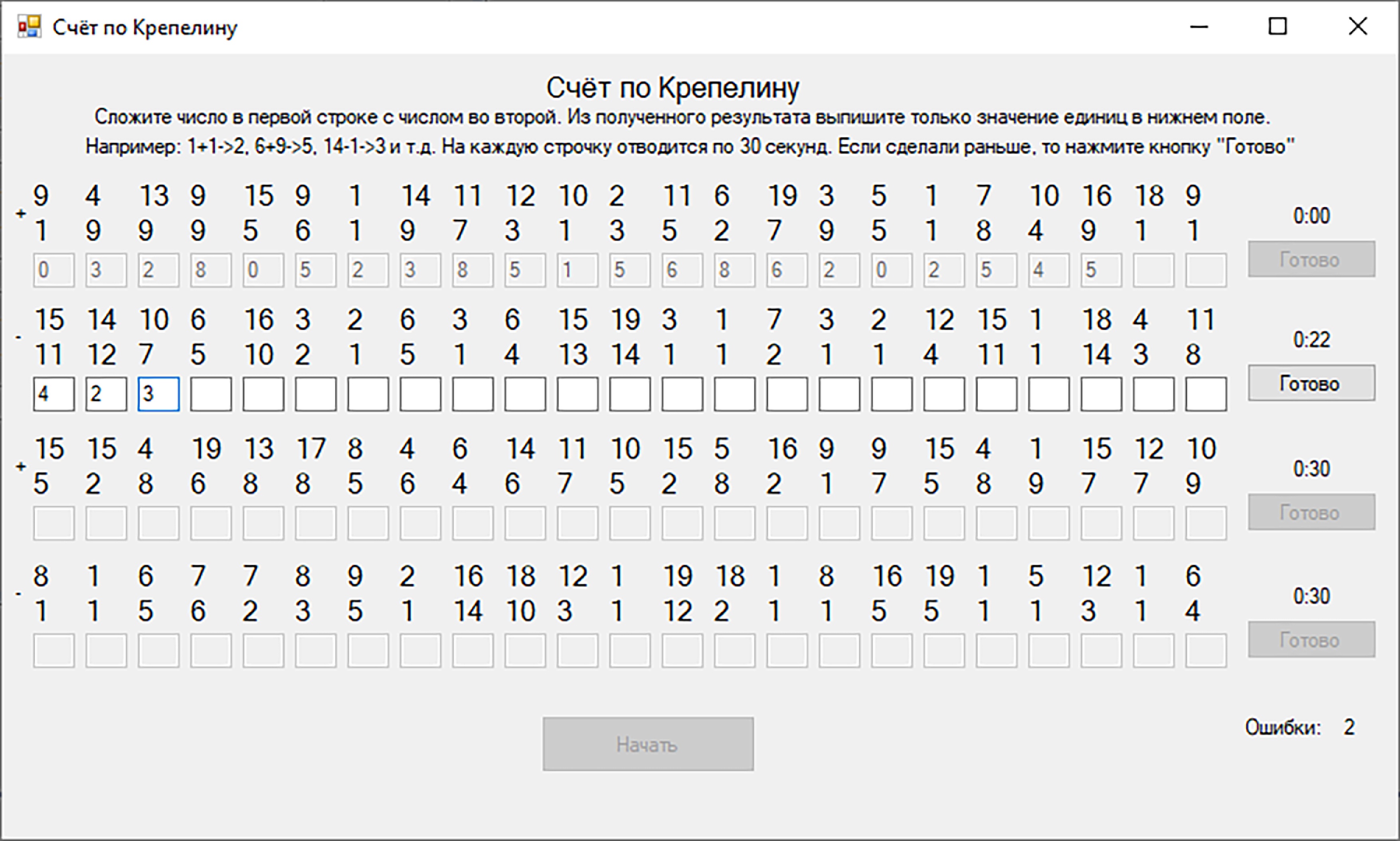 Пример одного из тестов (счёт по Крепелину) представлен на рисунке 2.