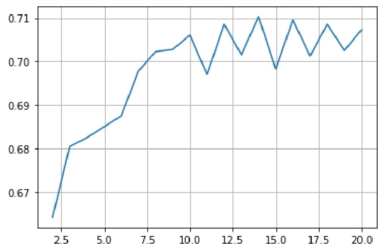 Для эмпирического оценивания и контроля обобщающей способности модели RF была применена процедура кросс-валидации для модели с выбранными по умолчанию параметрами. Как видно на рисунке 3, наилучший результат был получен при значении K=14.