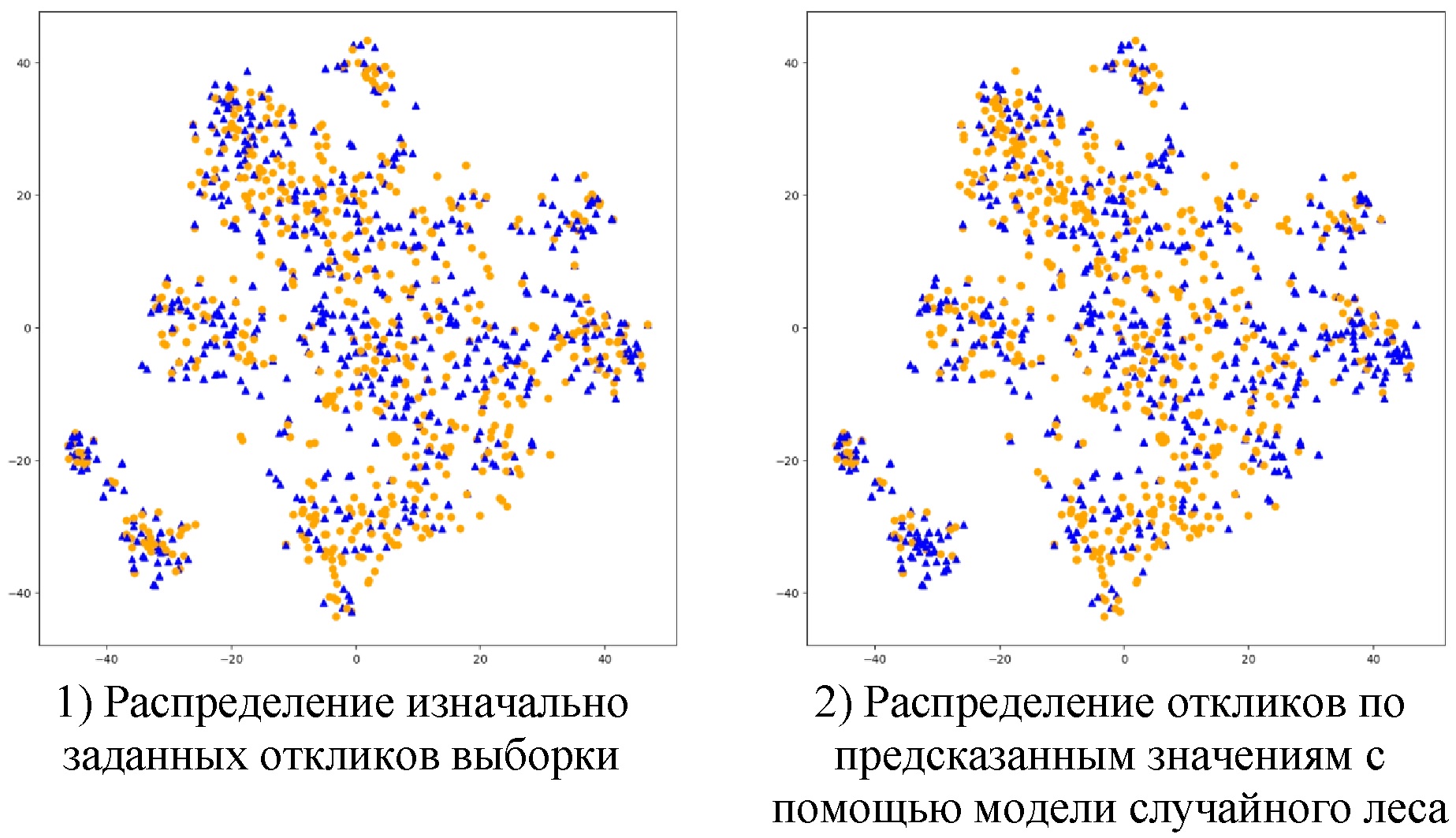 Для визуализации распределения изначально заданных откликов проверочной (валидационной) и предсказанной по модели RF выборок следует перевести значения из 24-х мерного пространства (по количеству признаков обучения) в двухмерное с помощью метода нелинейного снижения размерности и визуализации многомерных переменных t-SNE (t-distributed stochastic neighbor embedding) [Булатова и др., 2023]. Методика моделирует каждое наблюдение высокой размерности так, что похожие наблюдения будут близко располагаться в двухмерном пространстве [t-SNE …, s.a.; van der Maaten et al., 2008]. Распределение точек представлено на рисунке 4.