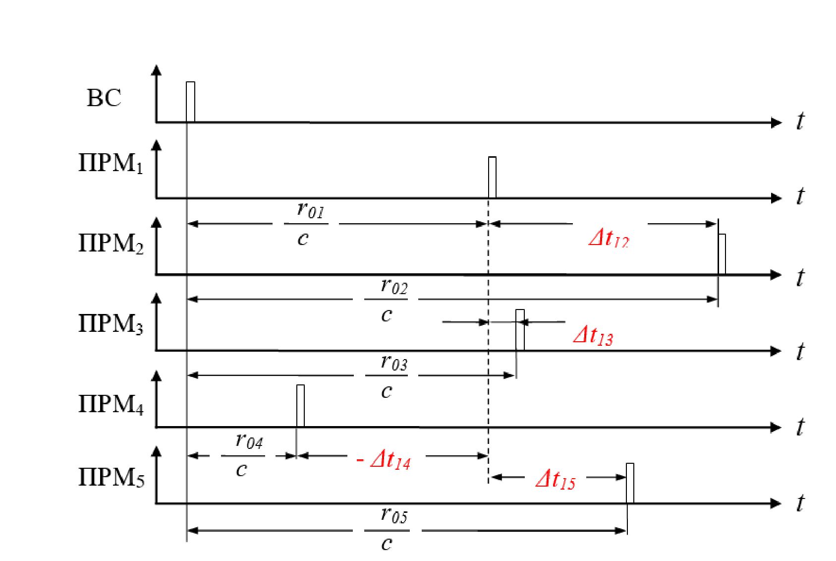 Представленный подход расчета разности расстояний и времени применяется при многопозиционном методе определения координат, временные диаграммы работы которого приведены на рисунке 8.