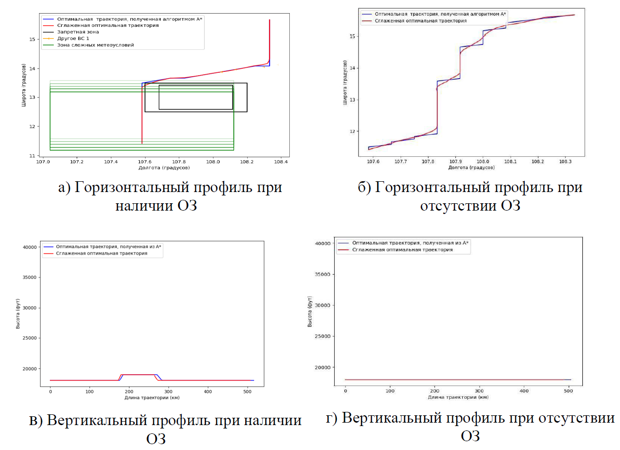 Для планирования оптимальной 4D-траектории, по которой движение ВС будет возможным с учетом динамических особенностей ВС и устранения его сближений с опасными зонами в ВП, в данной работе используются цифровой фильтр Савицкого-Голея третьего порядка и кубическая кривая Безье для сглаживания данных и построения сглаженной траектории внутри допустимого коридора заданного размера, соответствующего требуемой навигационной спецификации (в данной работе применяется RNAV/RNP2) и не превышающего вышеуказанные нормы эшелонирования.