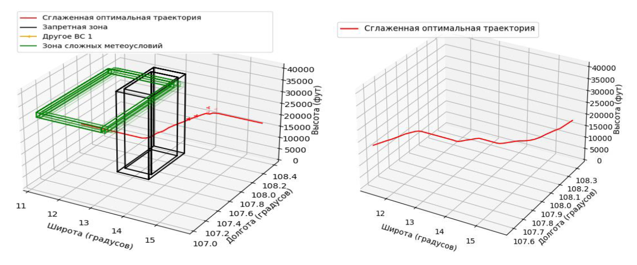 В качестве примера результатов проведенных экспериментов, на рисунках 5 и 6 представлены двухмерные и трехмерные графики планированных траекторий в географической СК с учетом ППТ (kППТ = kППТ_пор) при наличии опасных зон в ВП и без них, соответственно.