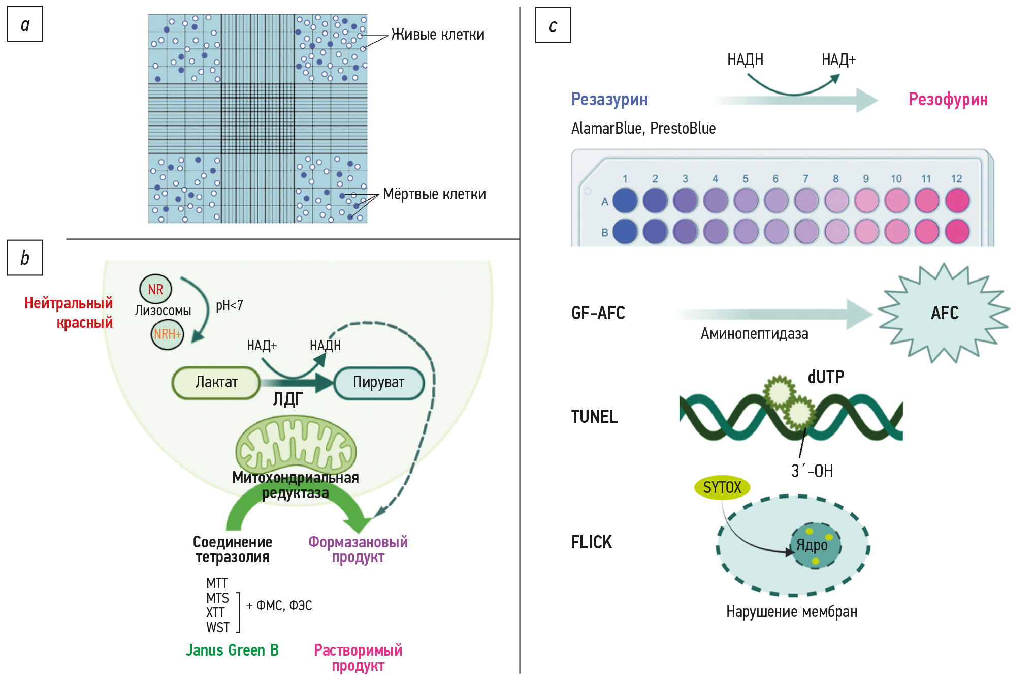 Оценка жизнеспособности и пролиферации клеток — необходимый этап многих биомедицинских исследований. Такая оценка используется, например, в фармакологии для определения возможного цитотоксического эффекта препаратов и химических веществ. Жизнеспособность и пролиферация оцениваются также после различных манипуляций с клетками, например криохранения, пересева или долгого культивирования. Результаты современных тестов могут предоставлять информацию не только о количестве клеток, доле живых клеток, но об их пролиферативной активности и метаболическом состоянии. В связи со всё большим распространением трёхмерных систем культивирования возрастает необходимость разработки точных методов для анализа жизнеспособности клеток в 3D-структурах и разнообразных биоматериалах. Выбор подхода к оценке жизнеспособности зависит от целей исследования, клеточной линии и других особенностей, с которыми предстоит работать, поскольку некоторые методы дают ложноположительные или ложноотрицательные результаты. Надёжный метод анализа жизнеспособности клеток должен точно определять и отличать процессы, сопровождающие их гибель. Потребность в простых, быстрых, точных и универсальных тестах для разных клеточных линий и структур обусловила появление разнообразных подходов для определения жизнеспособности клеток in vitro. В данном обзоре систематизированы сведения по некоторым методам оценки жизнеспособности клетки с описанием специфики и ограничений каждого метода, а также способов оптимизации их использования.