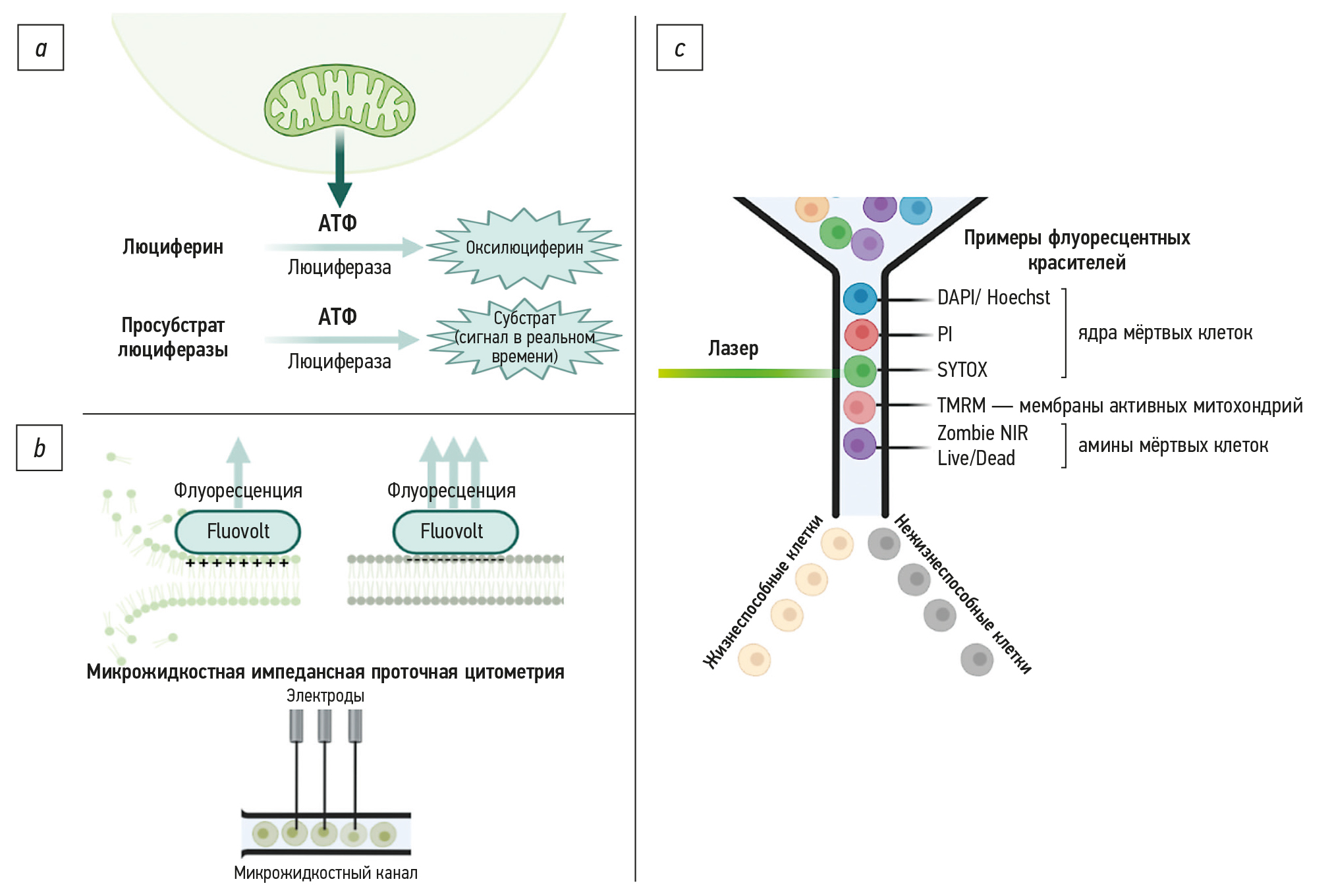 Fig. 2. High-tech (non-routine) methods for assessing cell viability: a — methods of luminometric analysis; b — labelless methods; c — analysis by flow cytometry. Here: АТФ — adenosine triphosphate, PI — propidium iodide, TMRM — tetramethylrhodamine methyl ester.