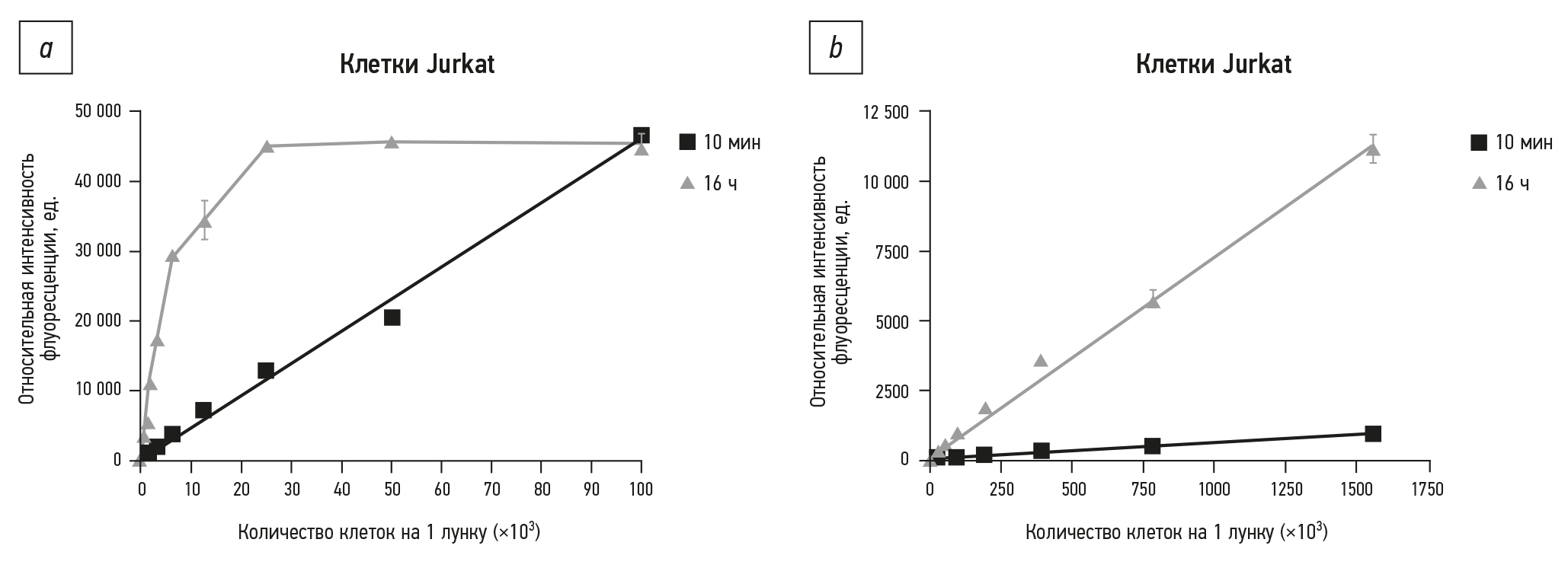 Рис. 3. Влияние количества клеток и времени инкубации с реагентом PrestoBlue на формирование флуоресцентного сигнала [48]: a — 10-минутный инкубационный период демонстрирует линейную корреляцию (r2=0,99) между флуоресценцией и числом клеток для 0–10×104 клеток; b — в течение 16-часового инкубационного периода снова наблюдается повышение чувствительности анализа, но потеря линейности выше 10 000 клеток на лунку.