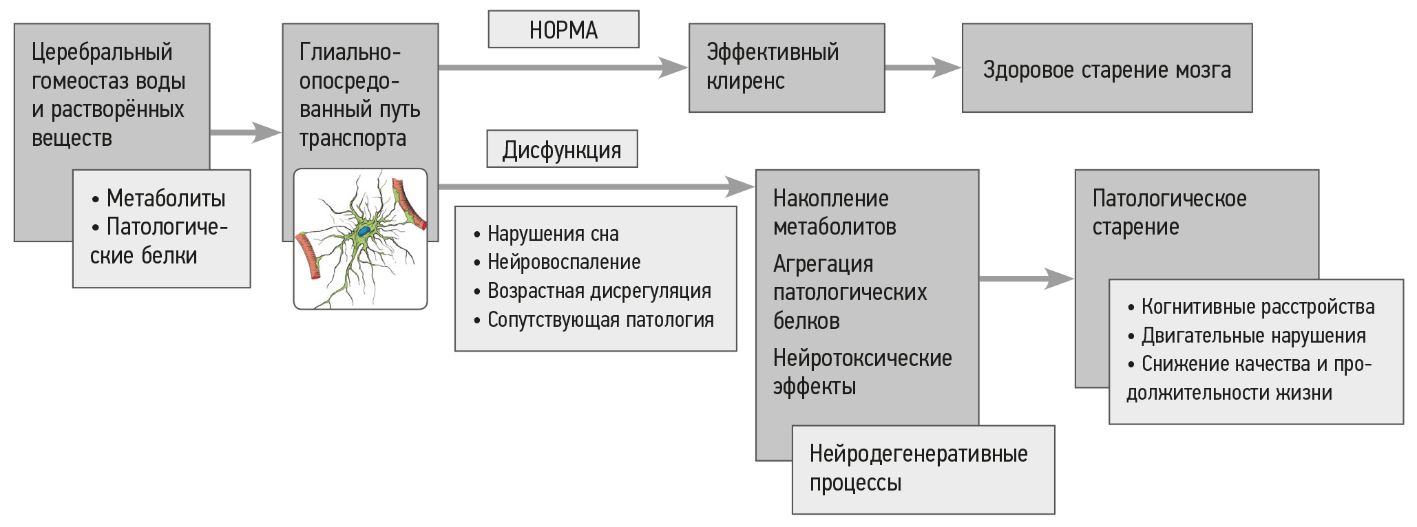 В исследованиях установлено нарушение глимфатической функции у трансгенных мышей при моделировании ключевых патологических событий других НЗ, как, например бокового амиотрофического склероза, или в мышиной модели, экспрессирующей гентингтин (болезнь Гентингтона). Помимо нейродегенеративных процессов, также сообщалось об изменениях в глимфатической системе и экспрессии аквапорина-4 как основной её детерминанты при гидроцефалии, инсульте, черепно-мозговой травме, церебральной амилоидной ангиопатии, рассеянном склерозе, сахарном диабете и других патологиях. В частности, показано, что черепно-мозговая травма, являясь фактором риска НЗ, способствует развитию тау-патологии на модели мышей с дефицитом аквапорина-4 [79–81]. Астроглиальный водный канал сверхэкспрессирован в месте инфаркта при ишемическом инсульте, а отложения фибрина и фибриногена способствуют окклюзии периваскулярных пространств при геморрагическом инсульте [4, 44, 64]. В целом дисрегуляция клиренса метаболитов, ассоциированная с возрастом и накоплением амилоидогенных белков, может быть в полной мере экстраполирована на любые экспериментальные модели нейродегенерации, поскольку одинаковым образом связана со снижением глимфатического транспорта жидкости [10, 34, 82–84] (рис. 2).