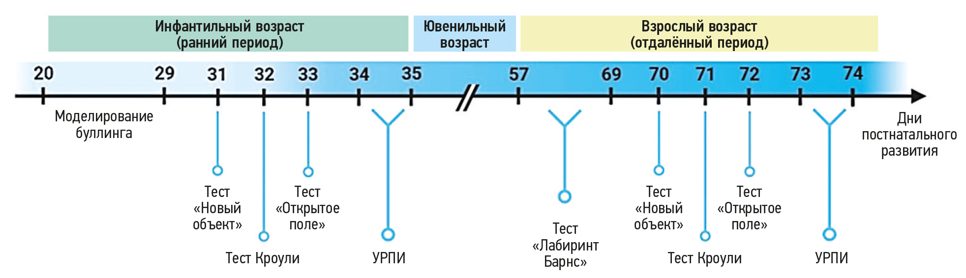 Хронический социальный стресс как модель буллинга в инфантильном возрасте у мышей приводил к повышенной тревожности в раннем и в отдалённом периодах, в то же время нарушенная рефлекторная локомоторная активность восстанавливалась во взрослом возрасте. Социальная активность, повышенная в раннем периоде, снижалась при взрослении. Распознавание неживых объектов нарушалось в инфантильном возрасте и восстанавливалось во взрослом, а социальное распознавание, наоборот, оставалось в пределах нормы в раннем периоде и снижалось в отдалённом. Формирование условных рефлексов находилось на уровне выше нормы как в инфантильном, так и во взрослом возрасте, а показатели обучаемости и долговременной пространственной памяти превосходили показатели животных интактной группы.