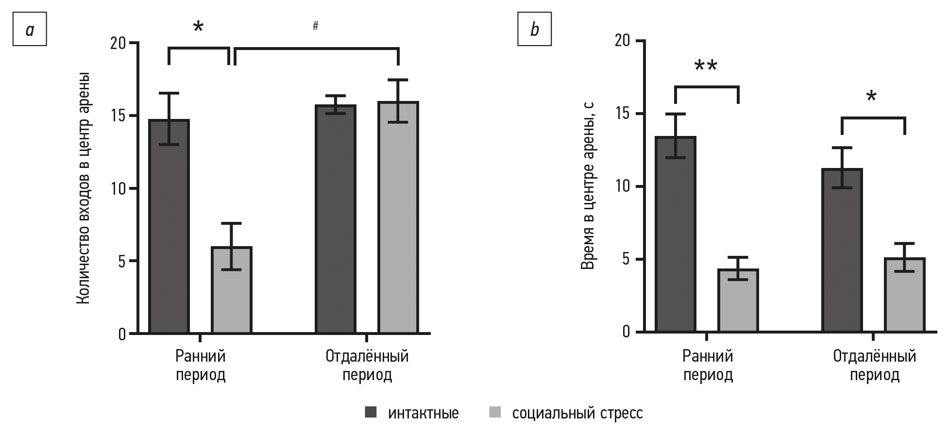 Рис. 3. Количество входов в центр арены (а) и время, проведённое в центре арены (b), в тесте «Открытое поле» у мышей линии C57Bl/6 после моделирования хронического социального стресса в инфантильном возрасте; *, ** статистически значимое отличие от значений интактной группы (p <0,01; p <0,001 соответственно); # статистически значимое различие между значениями группы социального стресса в раннем и отдалённом периодах (p <0,001).