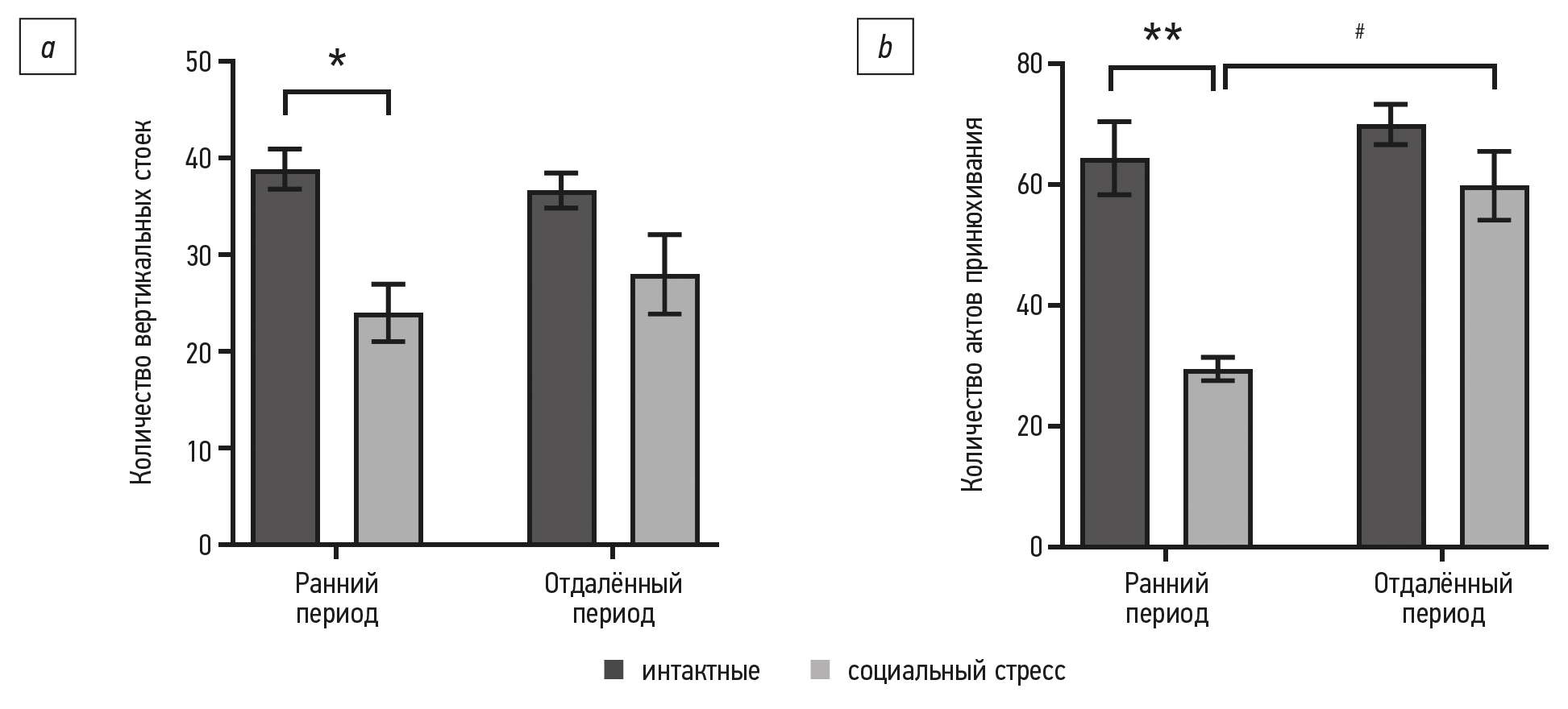 Рис. 5. Общее количество вертикальных стоек (а) и паттернов принюхивания (b) в тесте «Открытое поле» мышей линии C57Bl/6 после моделирования хронического социального стресса в инфантильном возрасте; *, ** статистически значимое отличие от значений интактной группы (p <0,01; p <0,0001 соответственно); # статистически значимое различие между значениями группы социального стресса в раннем и отдалённом периодах (p <0,001).