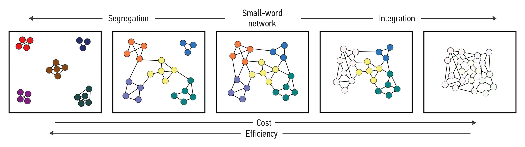 Fig. 1. Brain networks demonstrate a “small-world topology”, providing a balance between a regular network (leftmost), which promotes local efficiency in exchange for low costs, and a random network (rightmost), which delivers global efficiency at high cost. As segregation increases (right-to-left), the network is divided into modules, and its nodes are closely interconnected and poorly connected to the nodes in other modules. As integration increases (left-to-right), the number of connections between nodes increases, and individual modules merge into a single undifferentiated network. Rich clubs (yellow), formed by hubs of high centrality, provide global information pathways in the network. Figure adapted from [6].