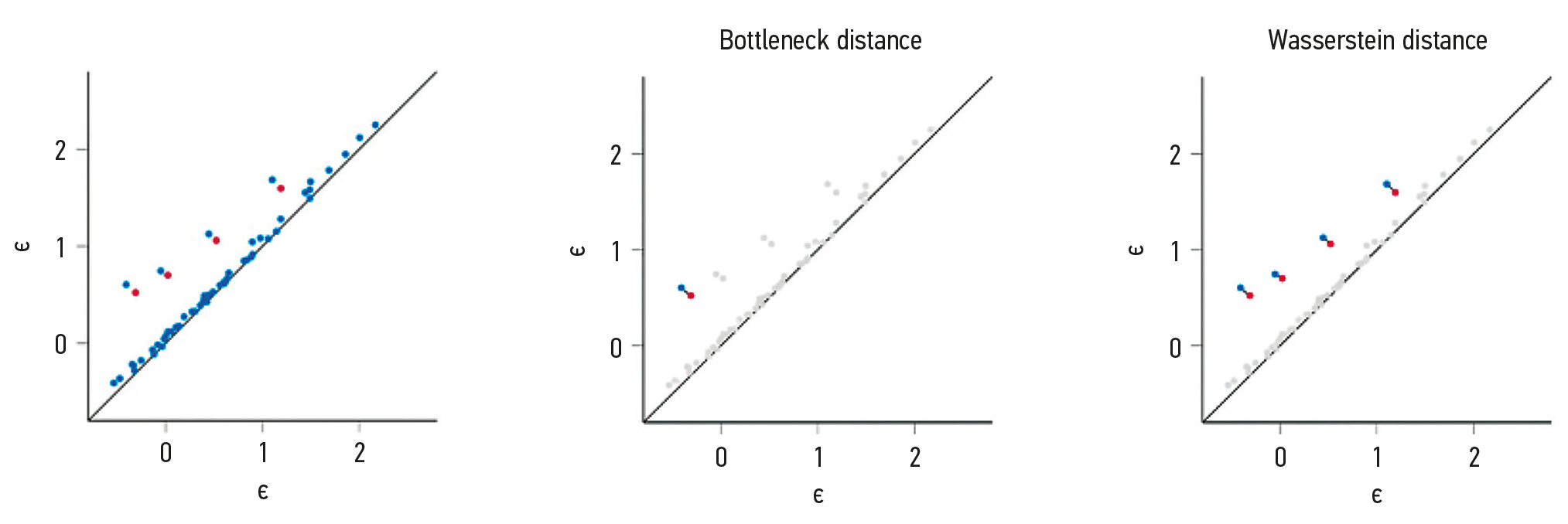Fig. 3. The left picture represents the combination of two persistence diagrams: D1 (blue) and D2 (red), and the dots correspond to moments of the homology vector space basis elements death at specific filtration step ε. The two right pictures represent the difference between the information taken into account in Bottleneck and Wasserstein distances between diagrams.