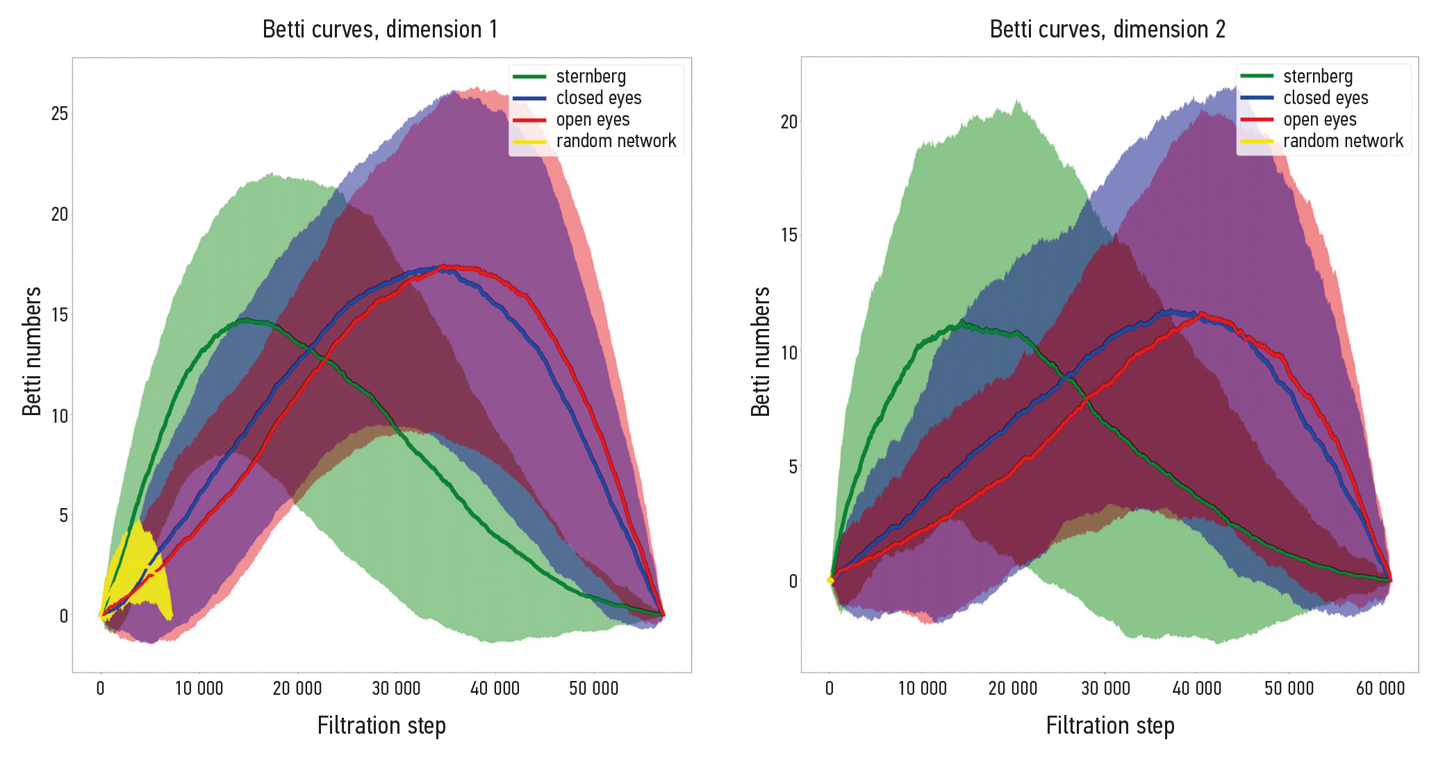 Fig. 5. Mean Betti curves for dimensions 1 and 2 averaged across all participants. The Y-axis corresponds to the Betti numbers of the specific dimension: 1 or 2. The X-axis corresponds to the filtration steps for an increasing sequence of parameter values {εi}N1, where N=60000. Here: sternberg, values for networks in Sternberg item recognition paradigm execution; closed eyes, values for networks in the resting state with closed eyes; open eyes, values for networks in the resting state with open eyes; random network, values for randomly generated networks of corresponding dimensions.