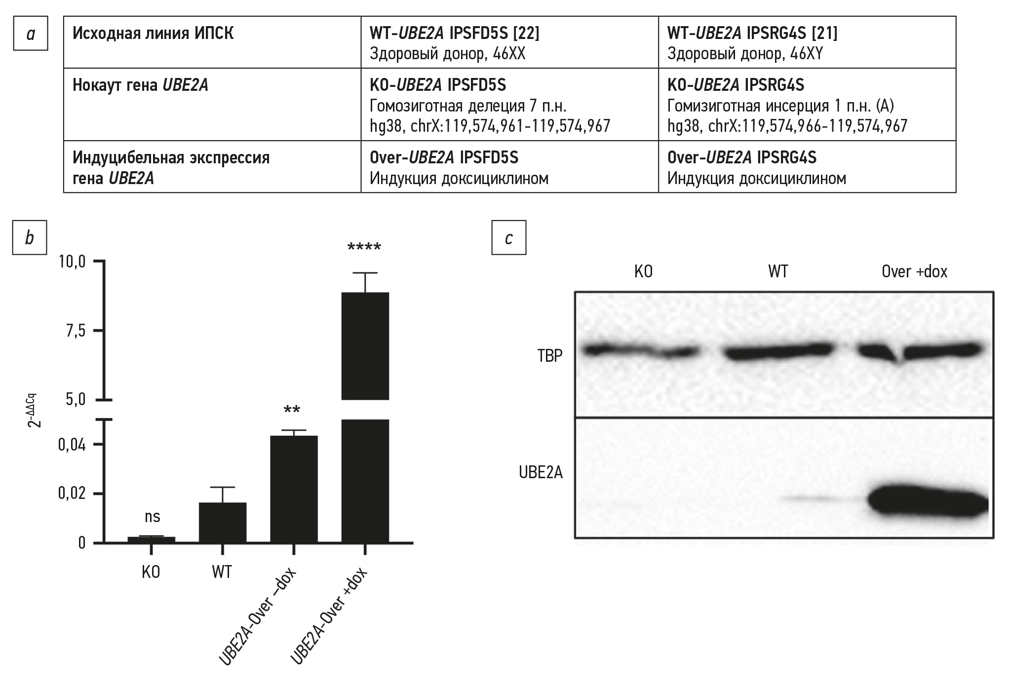 METHODS: Using genomic CRISPR-Cas9 editing and lentiviral transduction, a cell model based on iPSCs from two healthy donors was designed. This cell model includes isogenic iPSCs with knockout and inducible hyperexpression of UBE2A. In addition, iPSCs were obtained by reprogramming peripheral blood mononuclear cells of a patient diagnosed with X-linked mental retardation of Nascimento type, which has a deletion spanning the whole UBE2A locus.