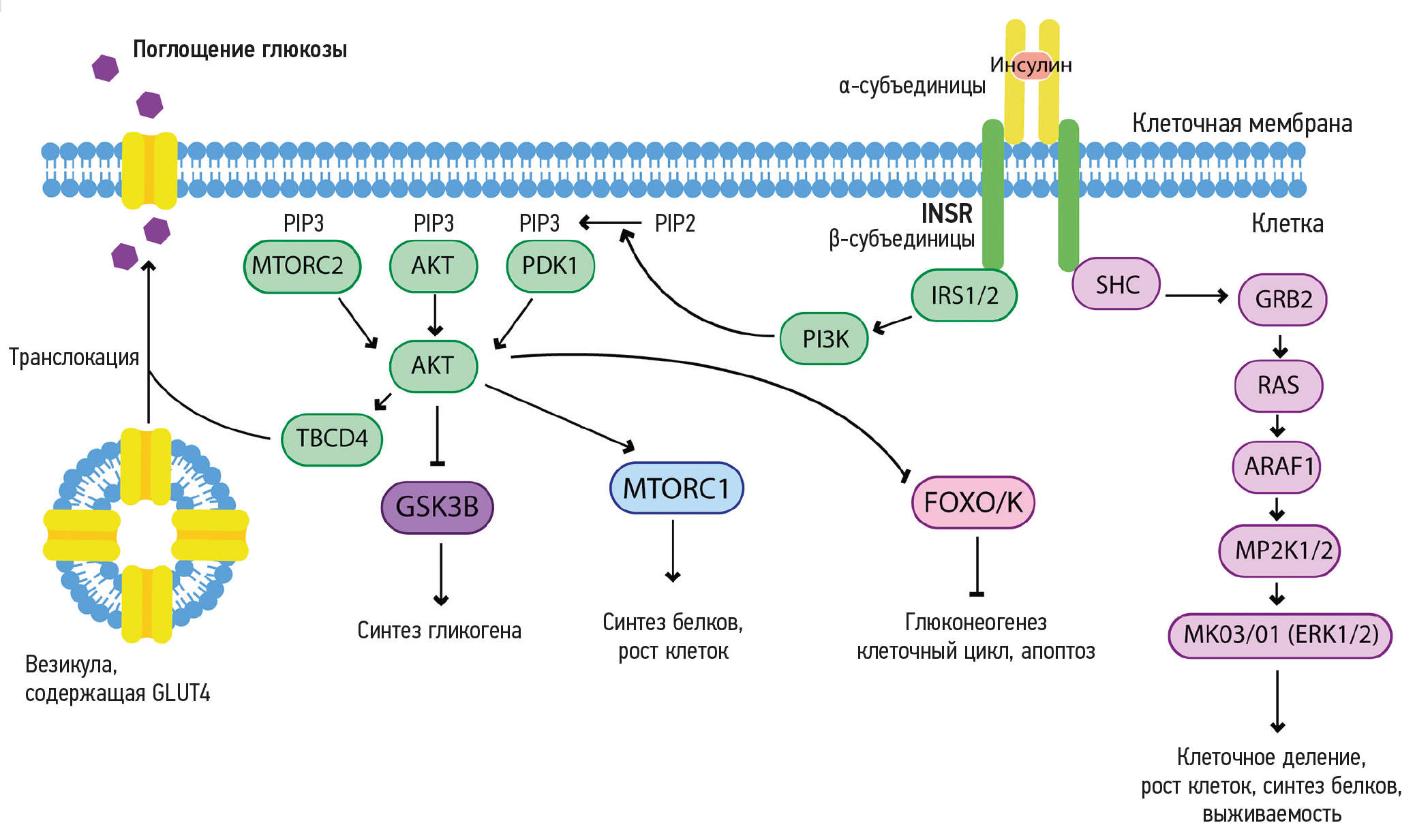 Молекулярные механизмы инсулинозависимого захвата глюкозы тканями достаточно хорошо изучены и связаны с активацией канонического инсулинового сигнального каскада «инсулиновый рецептор (insulin receptor, INSR)–фосфатидилинозитол-3-киназа (phosphoinositide 3-kinase, PI3K)–RAC-серин/треонин-протеинкиназа (AKT)» и последующей транслокацией на клеточную мембрану везикул, содержащих глюкозный транспортер 4 (GLUT4) [4, 6]. Развитие инсулинорезистентности в инсулин-чувствительных тканях (скелетные мышцы, печень и жировая ткань) связывают с нарушением активации этого каскада при стимуляции инсулином. Однако конкретные молекулярные механизмы нарушений инсулинозависимой активации каскада PI3K–AKT до сих пор остаются предметом дискуссии [7].