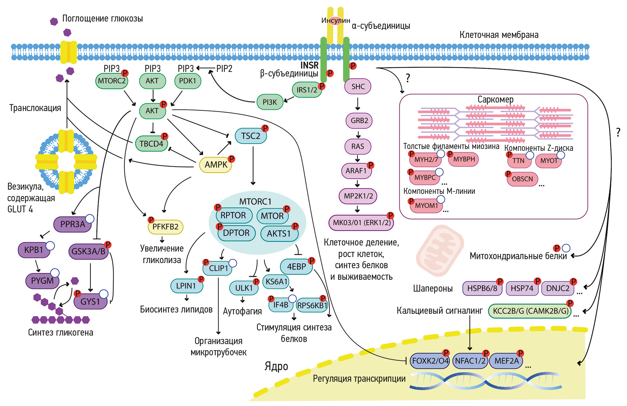 Активированный инсулиновый рецептор может регулировать множество других мишеней AKT-киназы, а также каскад митоген-активируемой протеинкиназы 3/1 (MK03/01) (киназа 1/2, регулируемая внеклеточными сигналами, ERK1/2). Поэтому эффекты, вызванные действием инсулина, оказывают комплексное влияние на внутриклеточную сигнализацию, регулируя различные клеточные процессы, а также экспрессию ряда генов (см. ниже). Нужно отметить, что плейотропные эффекты активации инсулинового рецептора (в том числе для скелетной мышцы) исследованы явно недостаточно, что связано прежде всего со сложностью изучения комплексных изменений в сети внутриклеточной сигнализации. В связи с этим использование широкозахватных методов анализа, в частности фосфопротеомного масс-спектрометрического анализа, представляет большой интерес. Нужно отметить, что современный фосфопротеомный анализ позволяет детектировать в пробах скелетной мышцы более 10 000 фосфосайтов, что составляет около 10% фосфопротеома [8], поэтому результаты таких исследований характеризуют только малую часть изменений последнего.