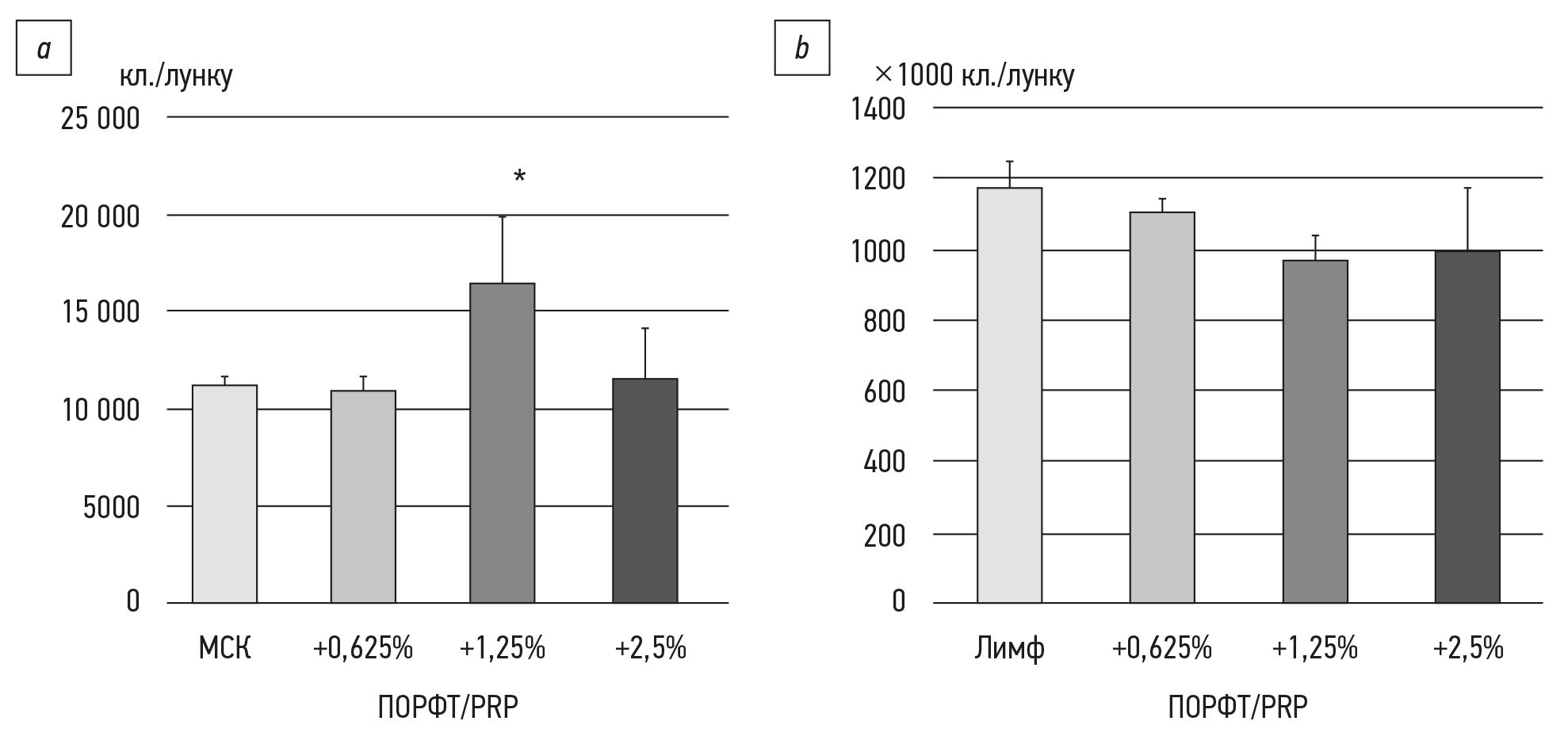 Рис. 2. Различная способность плазмы, обогащённой растворимыми факторами тромбоцитов (ПОРФТ/PRP), вызывать пролиферацию (a) мезенхимальных стромальных клеток (n=4) и (b) лимфоцитов селезёнки крыс (n=4). В лунки культур клеток исходно высевали 9000 МСК/мл (МСК) или 2 000 000 лимфоцитов/мл (Лимф); * р=0,025 по отношению к контролю МСК.