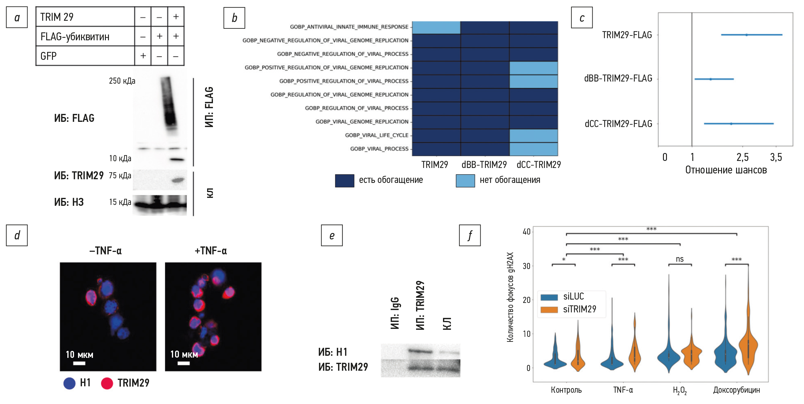 Fig. 3. TRIM29 is involved in the cellular response to stress: a: In vitro ubiquitination of proteins of the HEK293 cell line; western blot analysis of the FLAG-ubiquitin immunoprecipitate in the absence and in the presence of TRIM29; b: Heat map of biological pathways of cellular response to viral infection involving partner proteins and truncated forms of TRIM29-FLAG; c: Enrichment of partner proteins and truncated forms of TRIM29-FLAG in stress granule proteins; the vertical bar is the cut-off for the significance of the odds ratio Fisher’s exact test), which should not be crossed by the confidence intervals; d: Confocal microscopy of HEK293 cell culture overexpressing RFP-H1 and GFP-TRIM29 in the presence of TNF-α (+TNF-α; TNF-α, 100 ng/mL, 48 h) and in the absence of TNF-α (–TNF-α); RFP-H1 localization is blue, GFP-TRIM29 localization is pink; e: Western blot analysis of TRIM29-FLAG immunoprecipitate using histone H1 specific antibodies in the RWPE-1 TRIM29-FLAG cell line; f: The number of gH2AX foci in the nucleus of RWPE-1 cell line with and without TRIM29 knockdown affected by inflammatory (TNF-α, 100 ng/mL, 48 h), oxidative (H2O2, 0.1 μM, 48 h) and genotoxic (doxorubicin, 2 μM, 48 h) stress; ns, no significant differences; * p < 0.05; *** p < 1e–5; ИП, immunoprecipitation eluates are evaluated; ИБ, immunoblotting, membrane staining with antibodies against proteins of interest; КЛ, cell lysate; siTRIM29, TRIM29 knockdown, siLUC; knockdown control.
