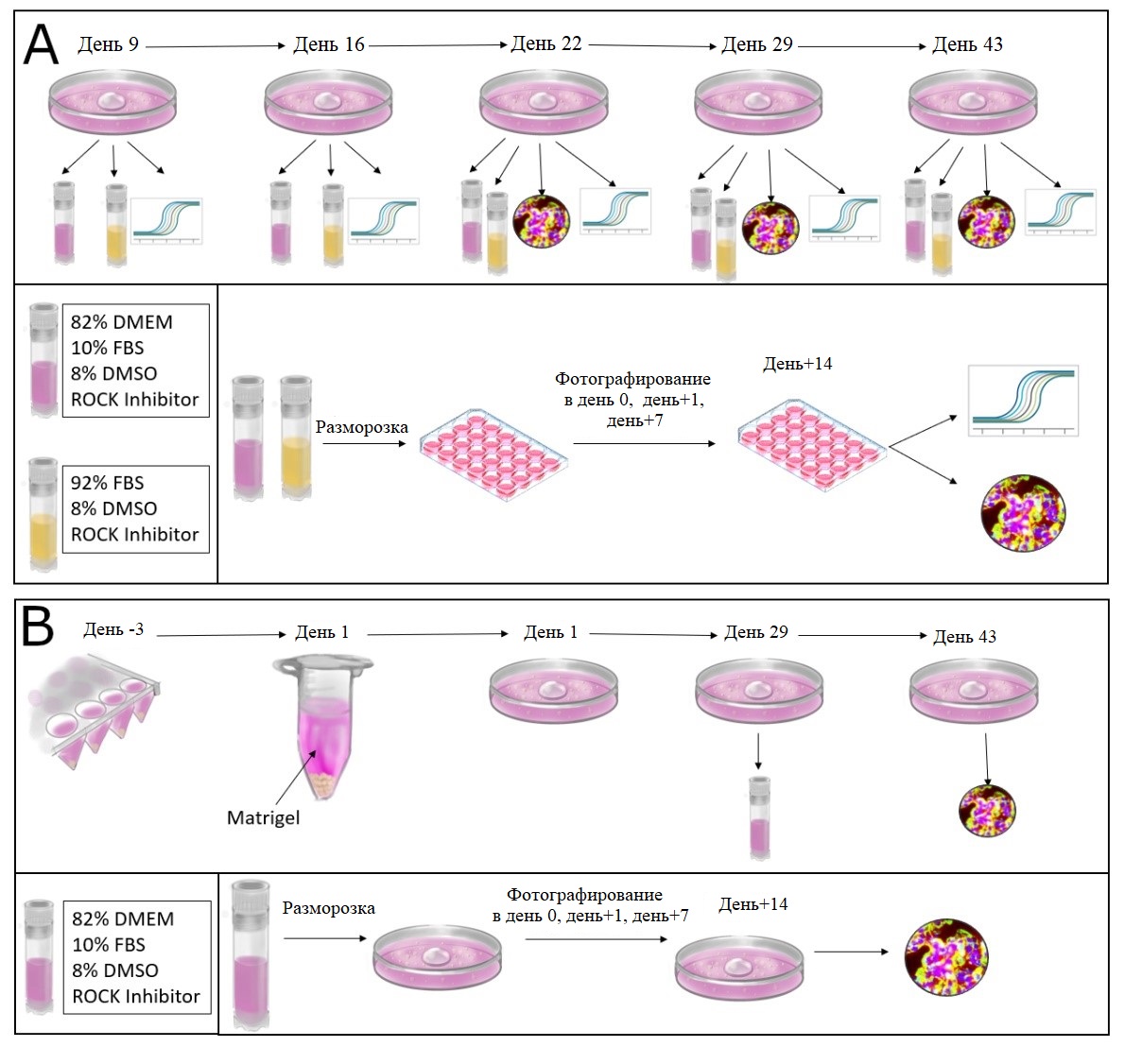 Примечание: FBS — фетальная бычья сыворотка (HiMedia, Индия), DMSO — диметилсульфоксид («ПанЭко», Россия), ROCK-ингибитор Y27632 — Rho-associated protein kinase inhibitor (Miltenyi Biotec, США).